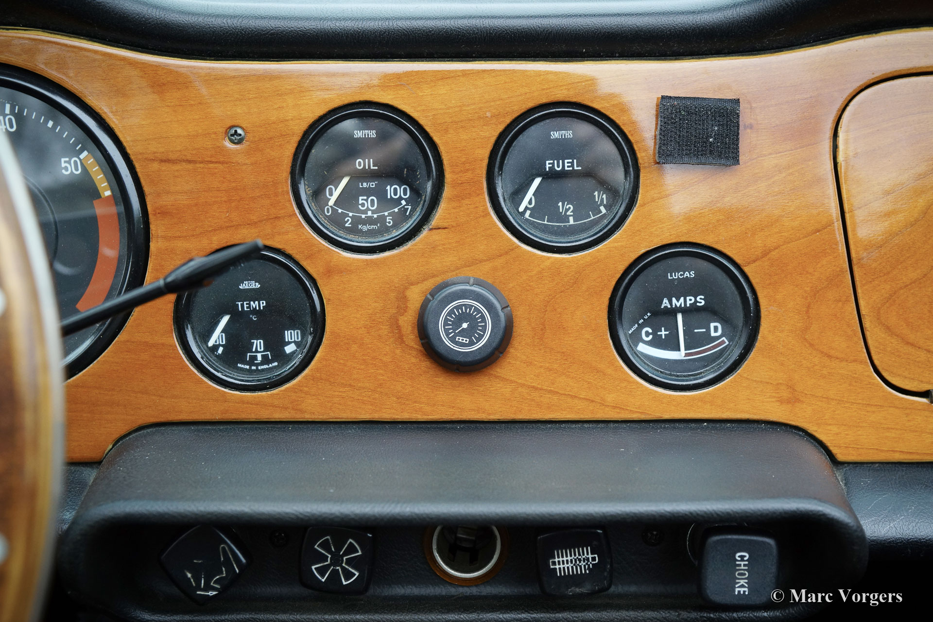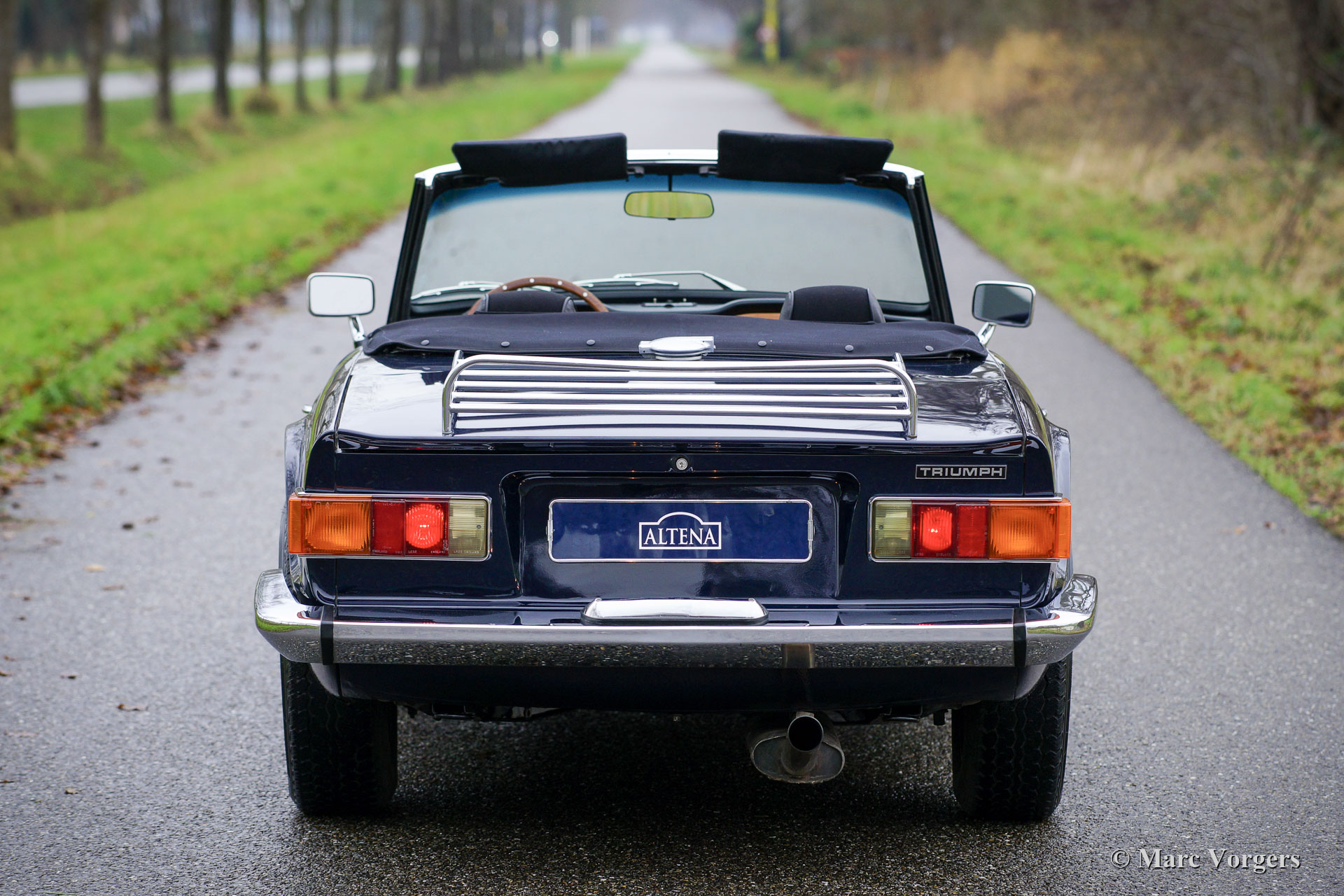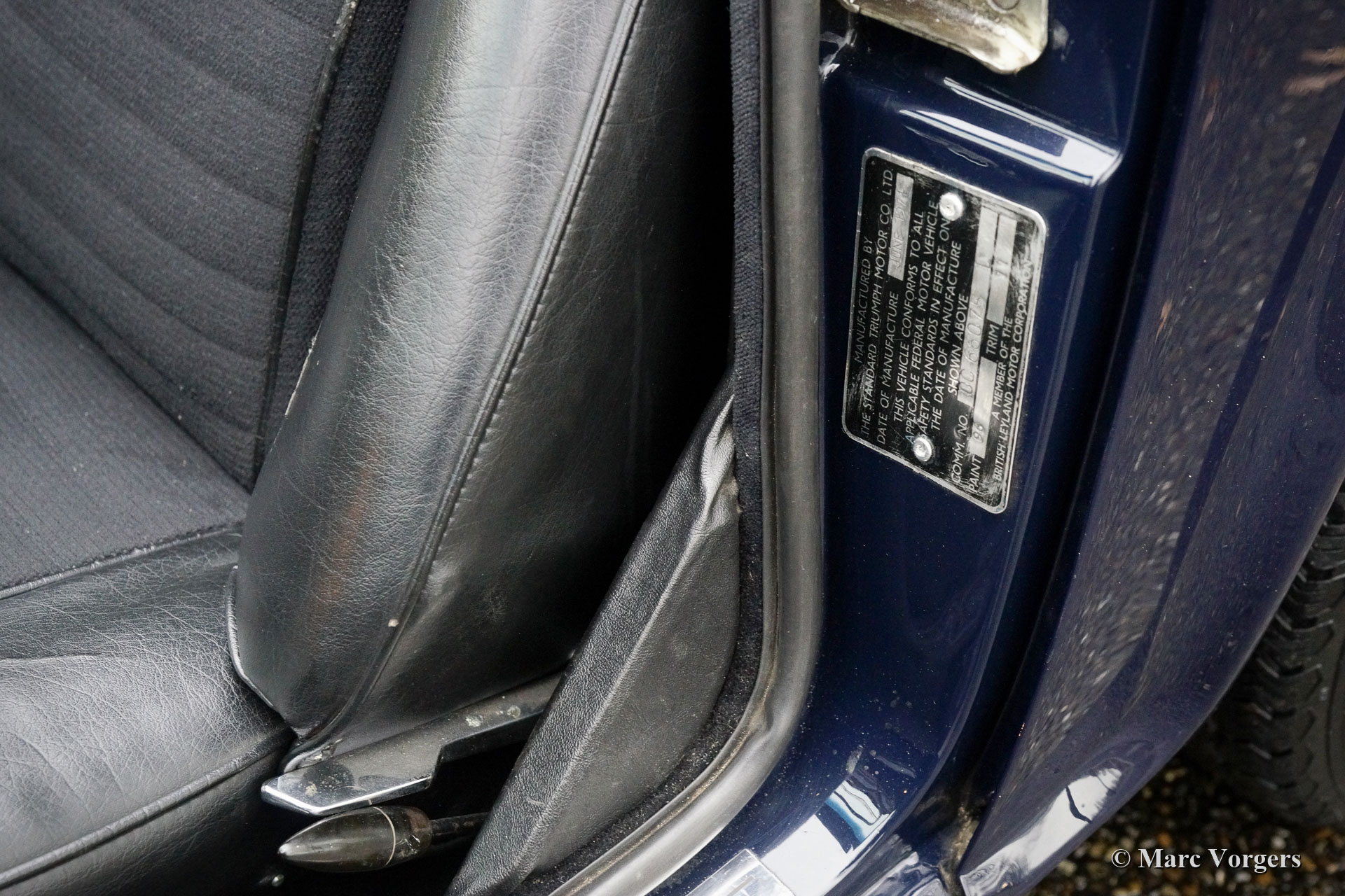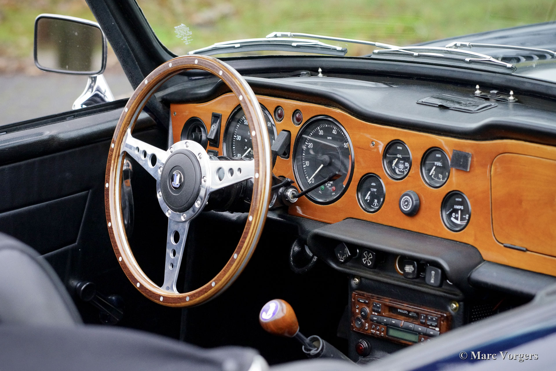 Triumph TR 6, jaar 1971. Kleur donkerblauw gecombineerd met een zwart vinyl/stoffen interieur en zwart tapijt. Zwarte soft-top, hoodcover en tonneaucover. Deze stoere en sportieve Triumph TR 6 werd nieuw verkocht in de Verenigde Staten (VS). In 1991 is de auto naar Nederland geïmporteerd. Vanaf 1991 werd de auto (gedurende 31 jaar!) gekoesterd door één eigenaar! In 2010 is de auto uitvoerig gerestaureerd en gereviseerd. Een fotoreportage van de restauratie is aanwezig. Eveneens aanwezig zijn twee grote dossiermappen met historische documenten, en service- en restauratiedocumenten/facturen. De TR 6 werd gerestaureerd met de nadruk op kwaliteit en uitstekende rijeigenschappen. De carrosserie vertoont uitstekende passingen van de plaatdelen, prachtig lak- en chroomwerk en de onderkant ziet er beter uit dan nieuw! De motorkap is voorzien van vijf rijen louvres om de koeling van de grote zescilindermotor te verbeteren. Deze fantastische Triumph TR 6 is voorzien van een 4-versnellingsbak met overdrive. Op een Triumph TR is de overdrive een echte 5e versnelling wat de rijervaring aanzienlijk verbetert. Verder is de auto voorzien van de originele stalen velgen, originele Stromberg carburateurs, origineel luchtfilterhuis, Vredestein 185/70 banden, een prachtig MotoLita stuur met houten rand, een RVS bagagerek, een RVS uitlaatsysteem, en een Philips autoradio met een front in houtoptiek. Deze sportieve Triumph TR 6 wordt compleet geleverd met een witte hardtop. Dit is een fantastische Triumph TR 6 in sublieme conditie uit langjarig eigendom!