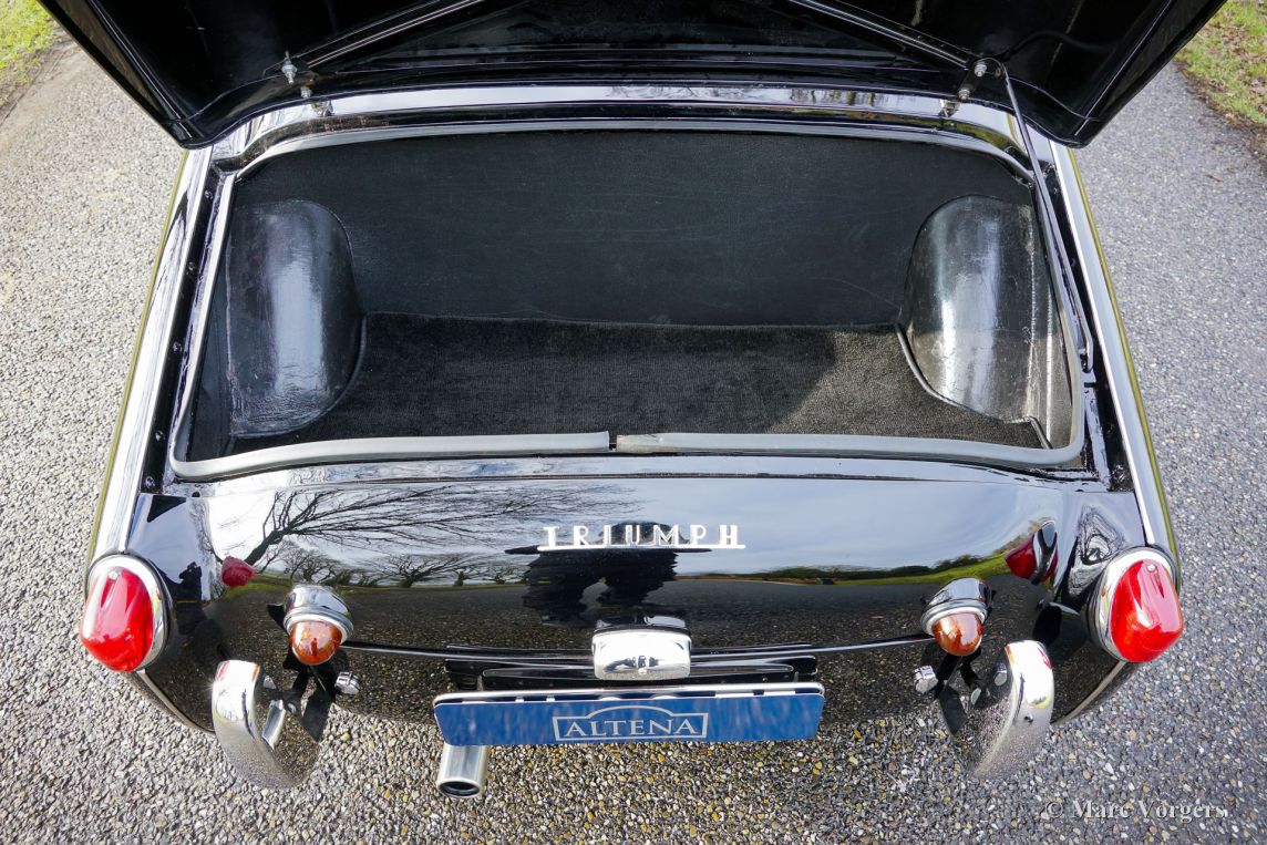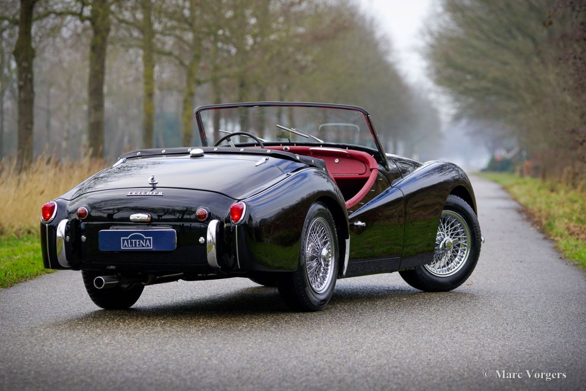 Triumph TR3A, jaar 1959. Chassisnummer TS40961L, motornummer TS41374E, carrosserienummer 1015991. De nummers zijn origineel af fabriek, (‘matching numbers’), een Heritage-document is aanwezig ter bevestiging. Carrosserie uitgevoerd in zwart gecombineerd met een roodlederen interieur afgewerkt met rood tapijt. Zwarte vinyl soft-top en afdekhoes. Deze prachtige Triumph TR3A is nieuw verkocht in de Verenigde Staten (VS) en is in het verleden naar Nederland geïmporteerd. In de periode 2024-2025 is de auto optisch gerestaureerd, de carrosserie is voorzien van perfecte nieuwe lak en het interieur is opgeknapt. De carrosserie vertoont een zeer goede passing van de panelen en de auto ziet er fantastisch uit in deze kleurencombinatie! De mechanische onderdelen zijn origineel en goed onderhouden; deze Triumph TR3A verkeert in zeer goede staat en de auto rijdt uitstekend. Deze Triumph TR3A toont prachtige originele details en is voorzien van chromen spaakwielen, een chromen versnellingspookknop en een chromen handremgreep. De Triumph TR3(A) is een sportieve klassieker die in de jaren 50 en begin jaren 60 zeer succesvol was in rally- en racecompetities. Op de openbare weg is het een fantastische auto om mee te rijden en daarbij biedt de auto een geweldige open rijervaring!