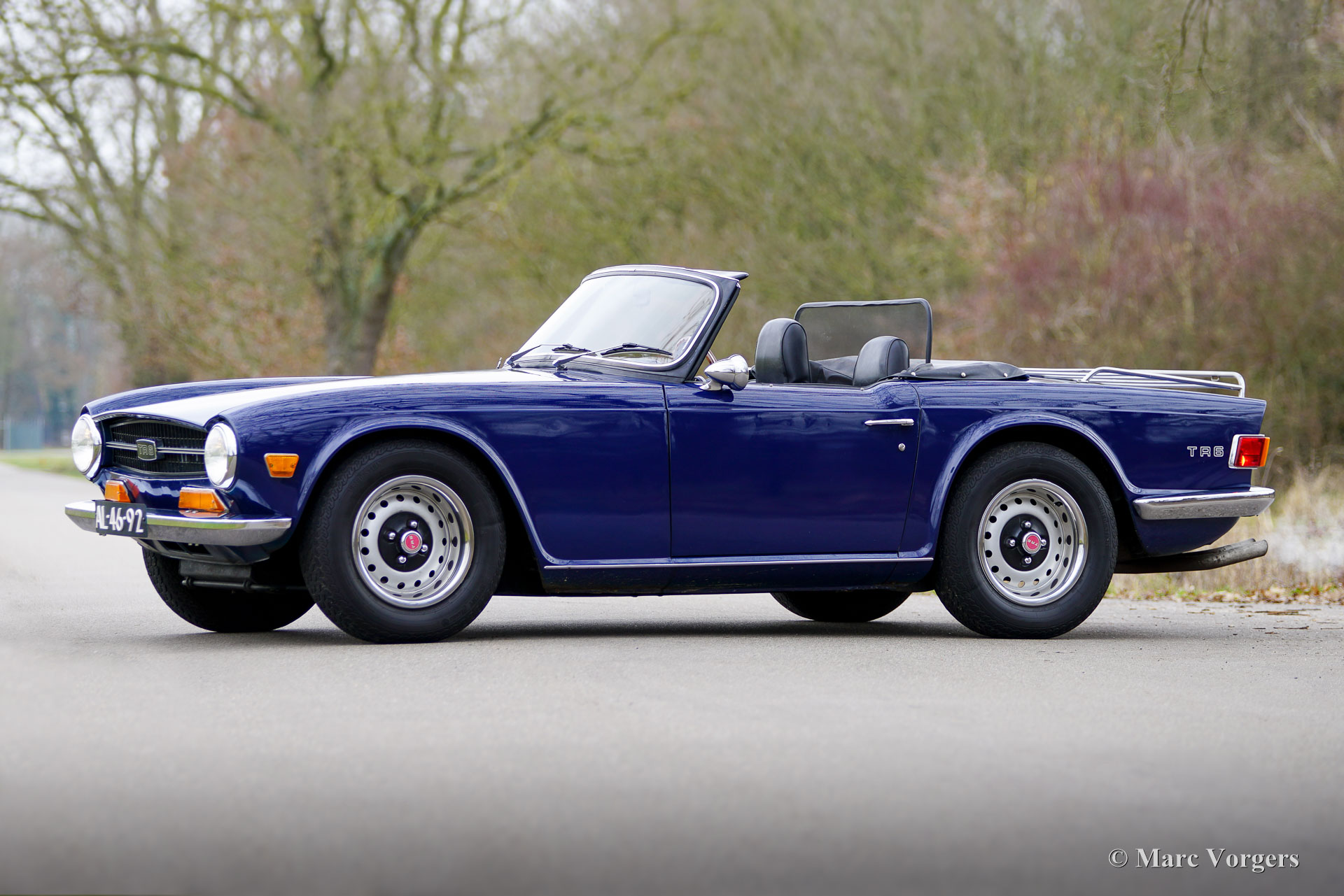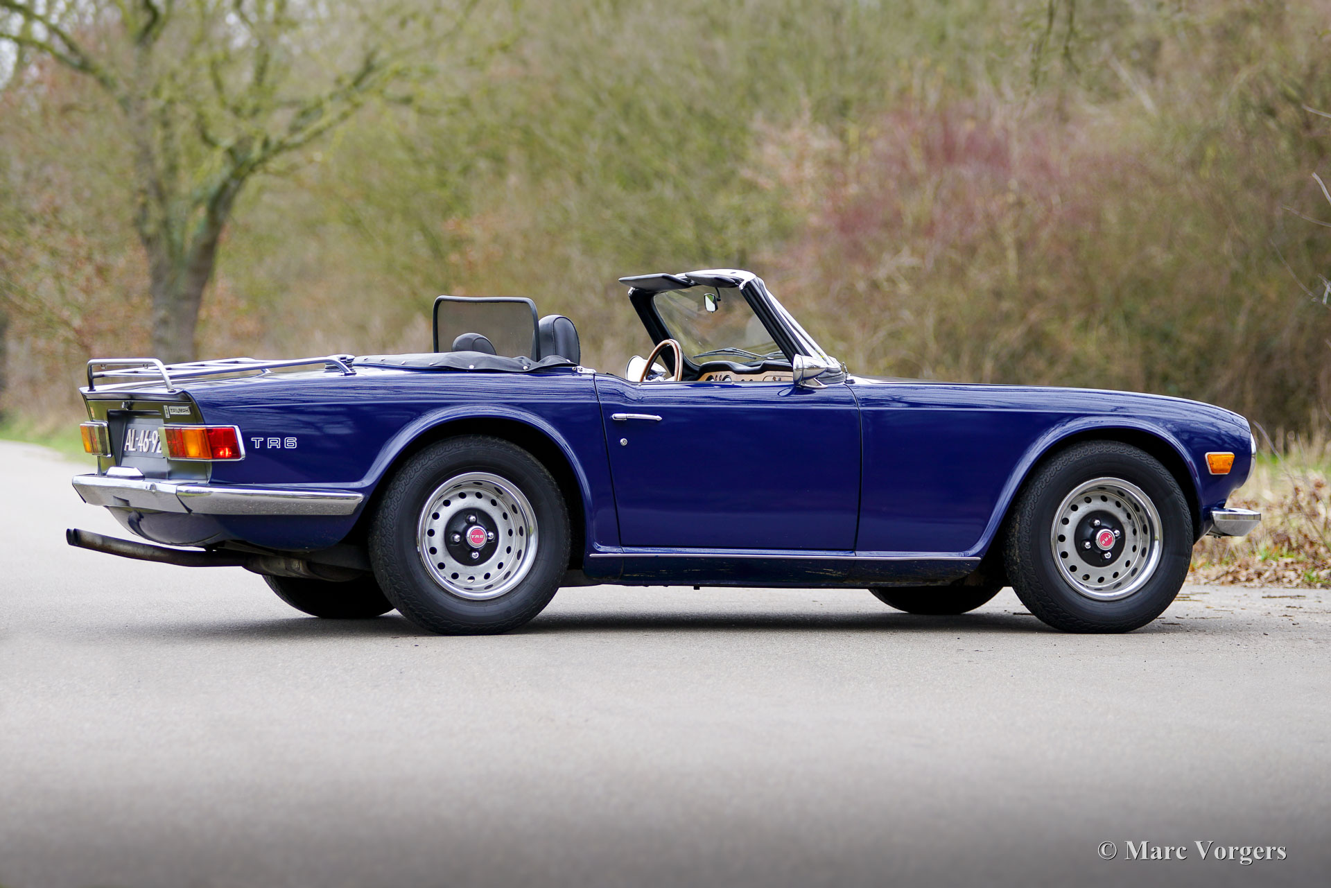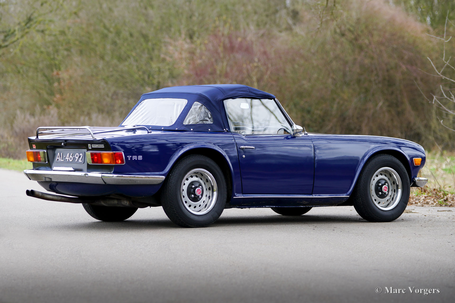 Triumph TR6, bouwjaar 1971 (eerste registratie 30 juni 1971). Chassisnummer 65860 CC. Uitgevoerd in blauw met een zwart kunstlederen interieur en zwarte vloerbedekking, presenteert deze Triumph TR6 uit 1971 zich als een goed onderhouden en eerlijke rijdersauto. Hij is voorzien van een blauwe mohair soft-top en een zwarte vinyl afdekhoes. Oorspronkelijk geleverd in de VS (Alaska), onderging de auto eind jaren 90 een volledige restauratie tot op het blanke metaal; foto's en een deel van de zover bekende Amerikaanse historie zijn bijgevoegd. De TR6 werd op 28 mei 2003 geïmporteerd in Nederland en is de afgelopen 23 jaar in het bezit gebleven van dezelfde eigenaar. Deze sportieve TR6 verkeert in goede rijdersconditie met sporen van gebruik en ouderdom (patina). De interieurbekleding en het dashboard zijn ooit vernieuwd. De auto is technisch en mechanisch gezien door de jaren heen stipt onderhouden, alle facturen zijn aanwezig. In 2018 zijn de complete koppeling en koppelingscilinder vervangen. In 2021 zijn de carburateurs gereviseerd; in 2023 zijn het ontstekingssysteem, de dynamo en de hoofdremcilinder vernieuwd; en in 2024 is de versnellingsbak gereviseerd voor een bedrag van € 3.890. De motor loopt en klinkt uitstekend en de versnellingsbak schakelt soepel en nauwkeurig. De afgelopen twintig jaar de eigenaar 20.000 mijl met volle teugen van deze TR6 genoten. De TR6 is uitgerust met de volgende opties: twee verchroomde buitenspiegels op de portieren, een windscherm achter de stoelen, een Moto-Lita sportstuur met houten rand, K&N sportluchtfilters op de Stromberg carburateurs en een verchroomd kofferrek. Deze goed onderhouden TR6 draagt zijn leeftijd en ervaring met charme. De TR6 is een sportieve metgezel voor zomeravonden en weekenduitstapjes, die een geweldige open rijervaring biedt, versterkt door het prachtige geluid van de zescilindermotor!