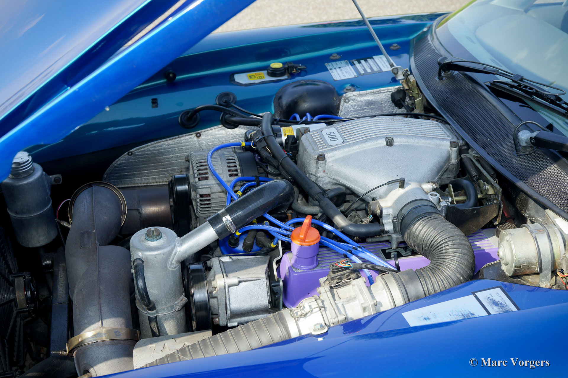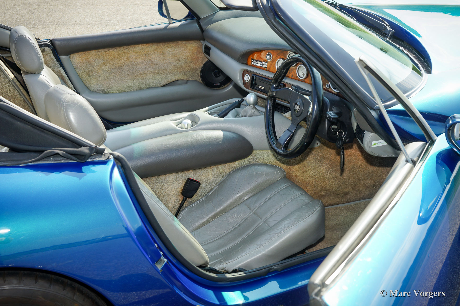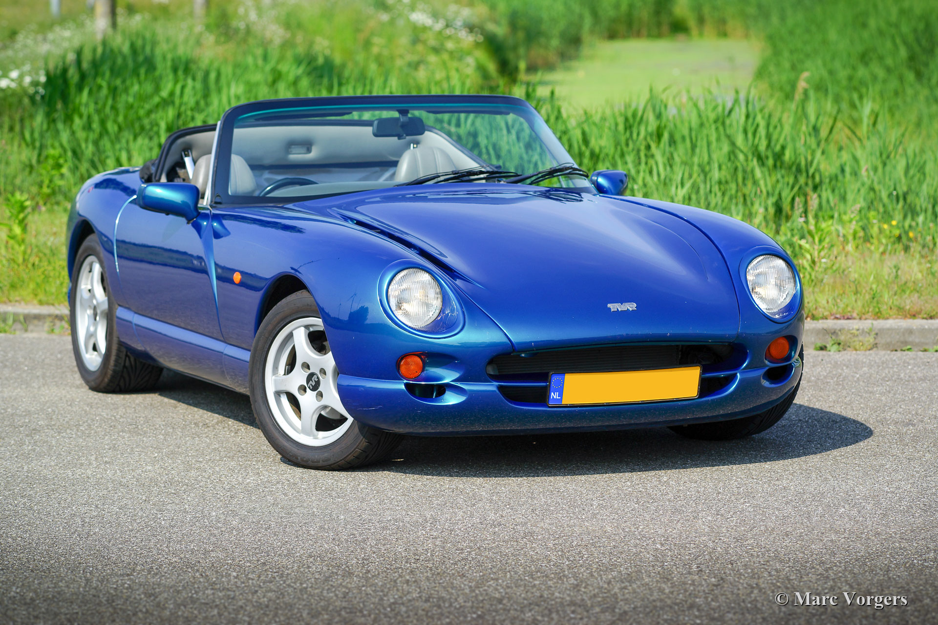 TVR Chimaera 500, Jaar 1997. Kleur Petrol-Blue metallic gecombineerd met een grijs leren interieur en beige tapijt. Zwart 'Targa'-dak met een uitneembaar middenpaneel en neerklapbaar achterstuk. Deze geweldige TVR Chimaera 500 is het topmodel met de zeer krachtige 5,0 liter V8-motor. Er zijn slechts 600 auto's van dit '500'-model gebouwd. De motor levert 345 pk en de ‘soundtrack’ is verslavend!
