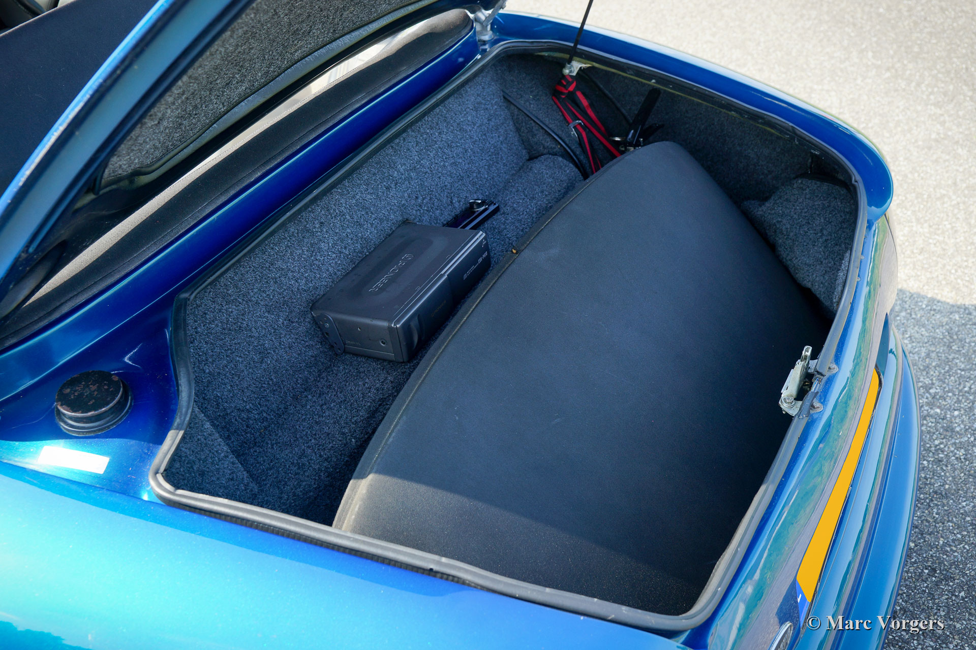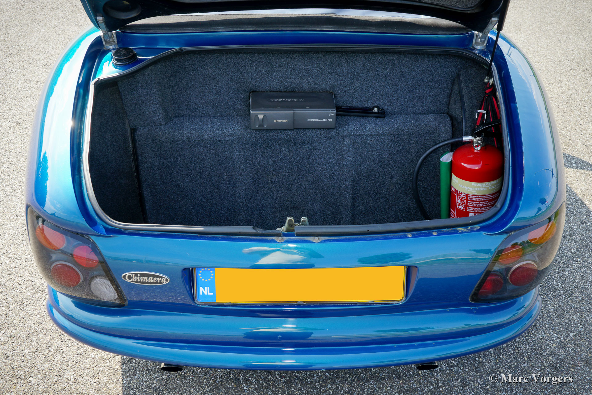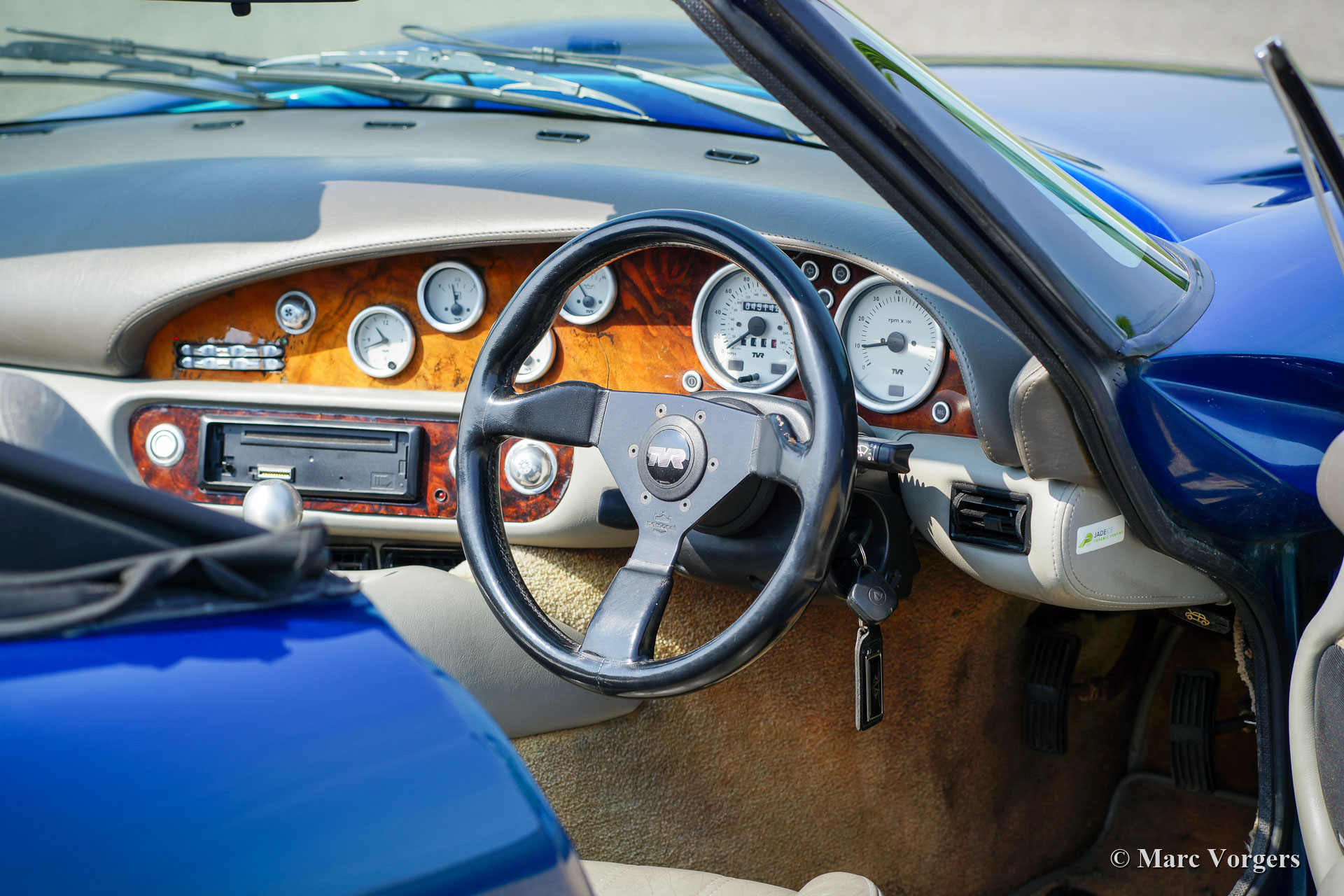 TVR Chimaera 500, Jaar 1997. Kleur Petrol-Blue metallic gecombineerd met een grijs leren interieur en beige tapijt. Zwart 'Targa'-dak met een uitneembaar middenpaneel en neerklapbaar achterstuk. Deze geweldige TVR Chimaera 500 is het topmodel met de zeer krachtige 5,0 liter V8-motor. Er zijn slechts 600 auto's van dit '500'-model gebouwd. De motor levert 345 pk en de ‘soundtrack’ is verslavend!
