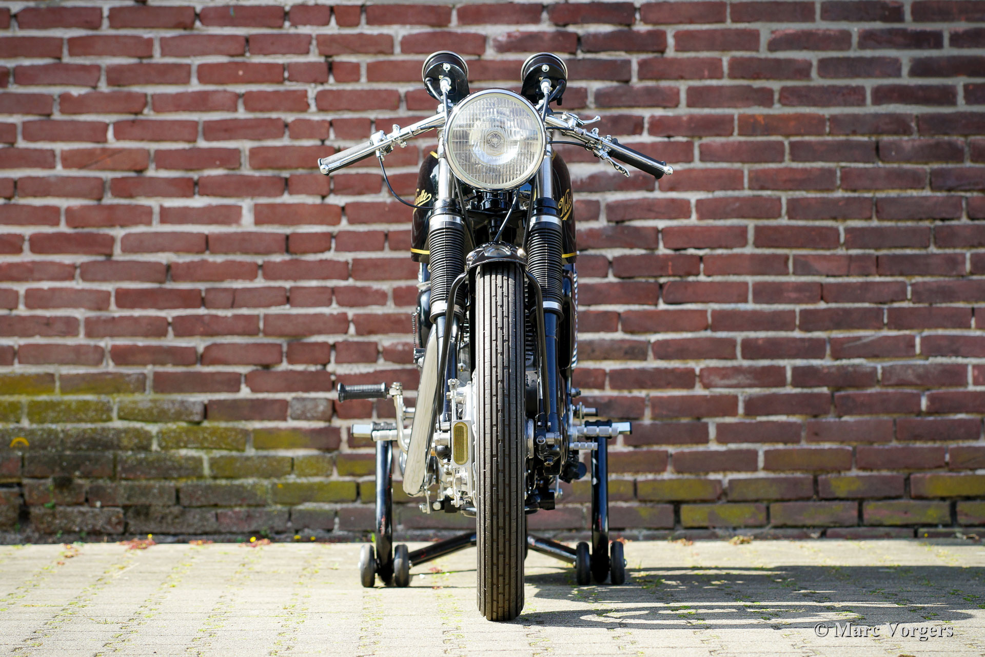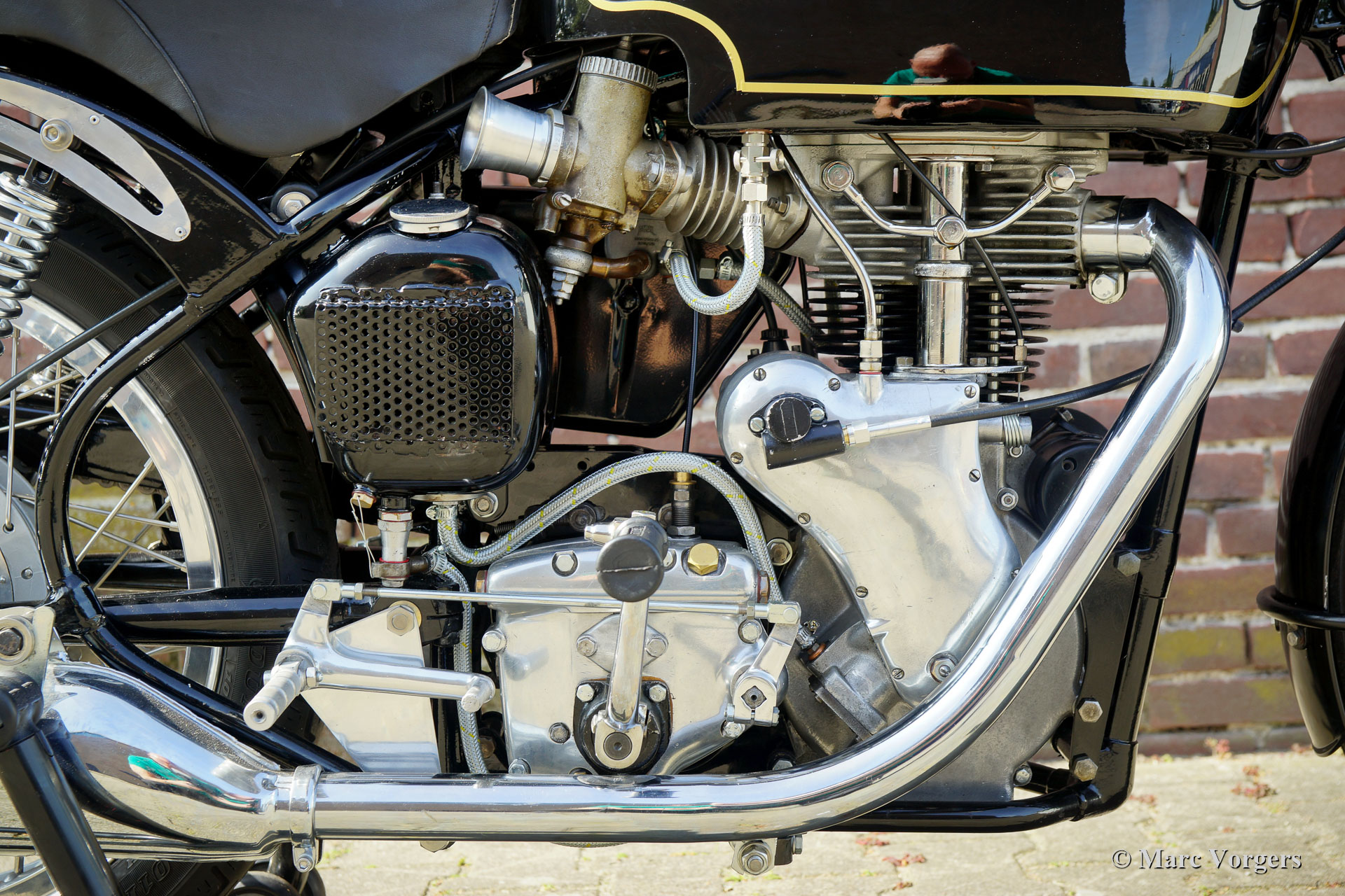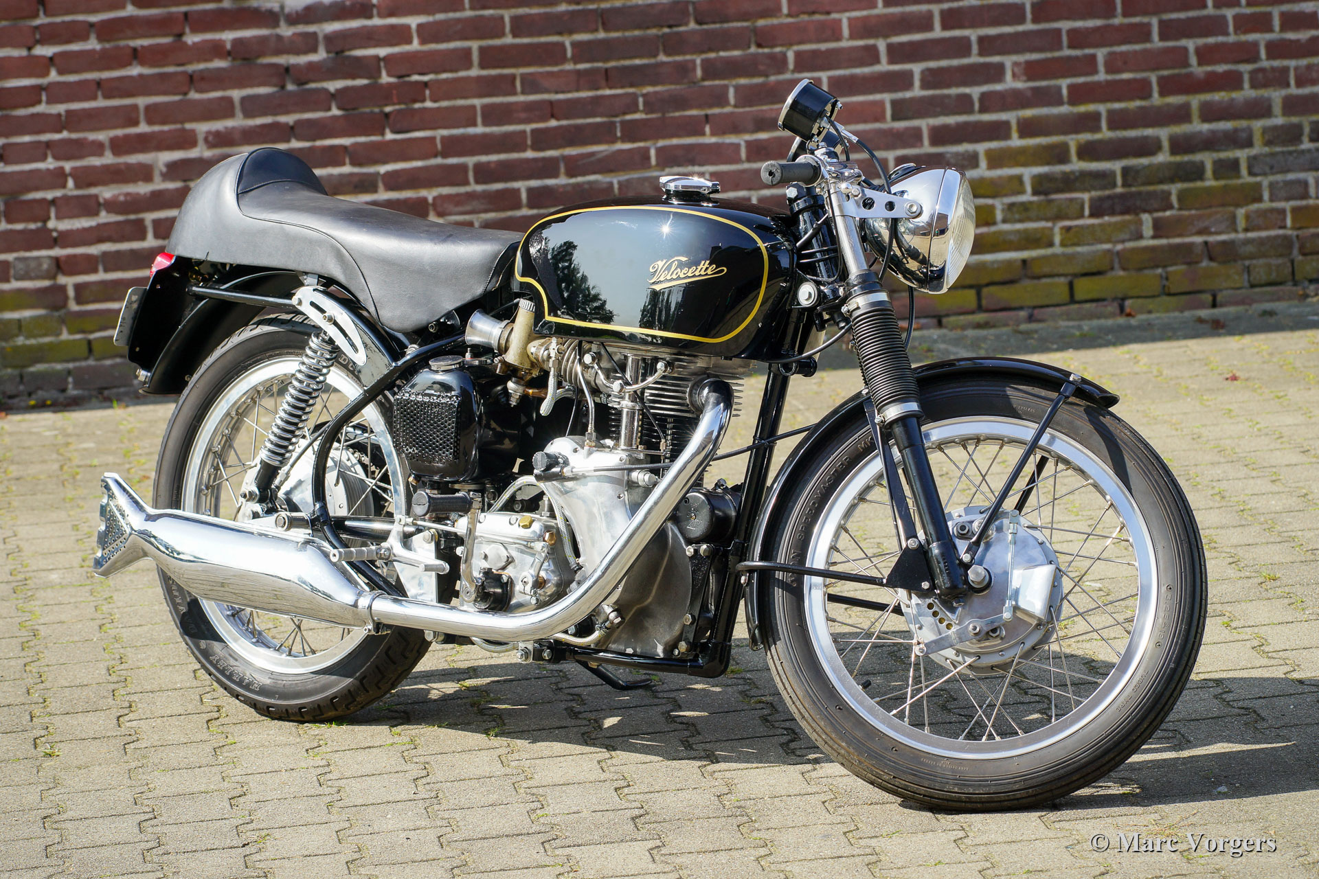 Velocette Venom Thruxton 500cc, jaar 1963. Kleur zwart met gouden striping. Velocette is een van de legendarische Britse motormerken. Velocette heeft vele overwinningen behaald in de geschiedenis van de motorsport en de machines waren zeer succesvol in de spannende ‘Manx’ TT-races op het eiland Man. De Venom Thruxton is een van hun laatste ontwerpen. De Venom Thruxton heeft een krachtige eencilinder viertaktmotor van 500 cc met bovenliggende kleppen. Deze Velocette Venom-motorfiets is volledig gerestaureerd, gereviseerd en opnieuw opgebouwd volgens Thruxton specificaties en volgens de hoogste normen. Halverwege de jaren zestig werd het motorblok gebruikt door de bekende Nederlandse motorcoureur Jan Strijbis die in 1976 als laatste racer deelnam aan een TT op een Velocette. Het motorblok werd opgebouwd met gebruikmaking van nieuwe onderdelen volgens de racespecificaties van Strijbis. Gemonteerd zijn een Thruxton cilinderkop met 2 inch inlaatklep, Thruxton Racing nokkenas, racekoppeling met 20 veren, een GP2 Amal race carburateur. De versnellingsbak is een Thruxton close-ratio-eenheid. De speciale race-krukas, drijfstang en zuiger zijn gebalanceerd en gewogen. Deze motor loopt indrukwekkend krachtig en is geschikt voor gebruik op de weg en op het circuit. De motorfiets toont de fantastische originele Velocette Venom en Thruxton details zoals de speciale benzinetank, de olietank met hitteschild, de grote geventileerde trommelrem voor en de aluminium velgen met RVS spaken. Deze zeldzame Velocette Venom Thruxton toont geweldig en zal een blikvanger zijn op elke historische motorbijeenkomst. Deze Velocette-motorfietsen zijn erg moeilijk te vinden, een bijzonder verzamelobject!