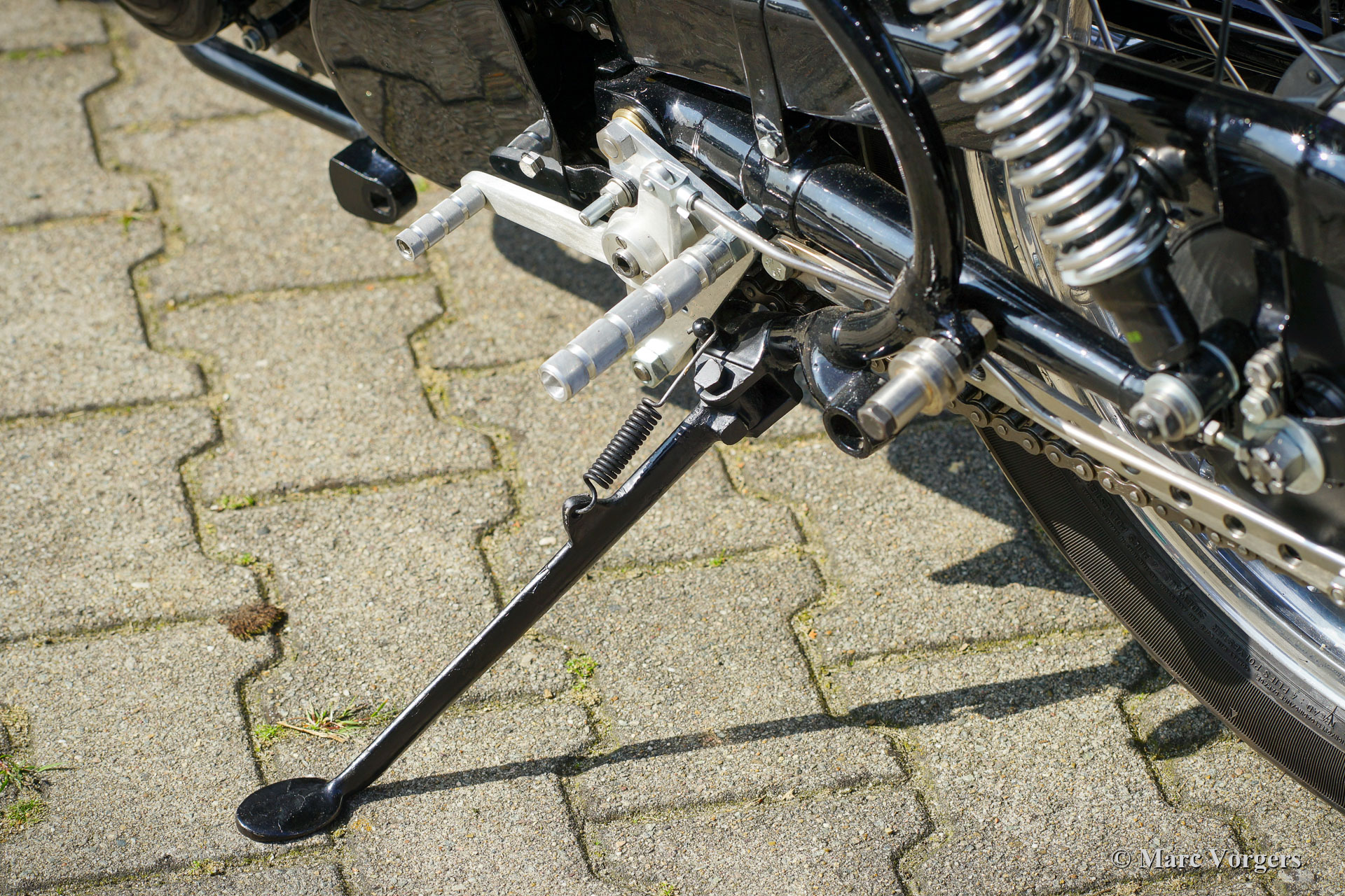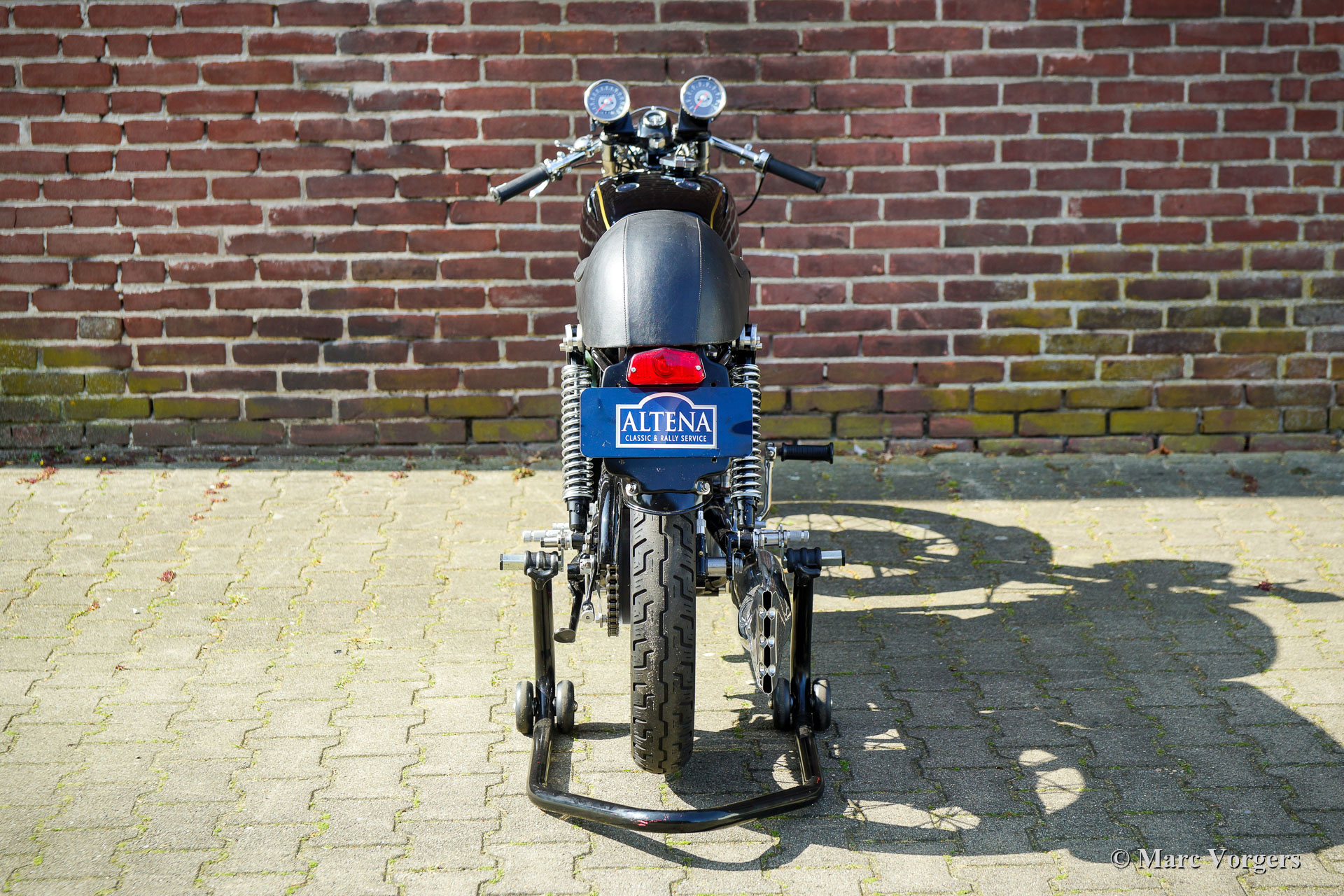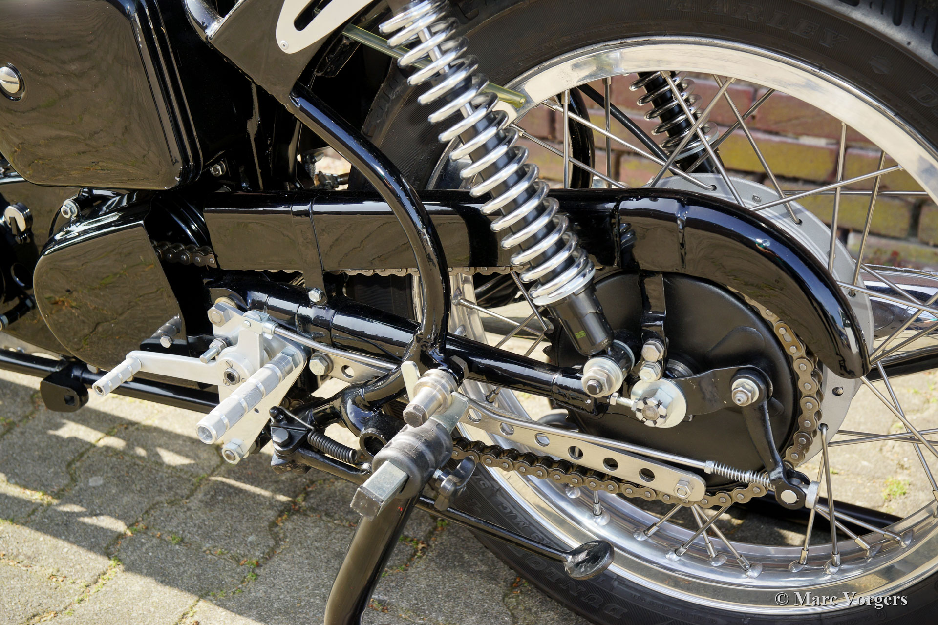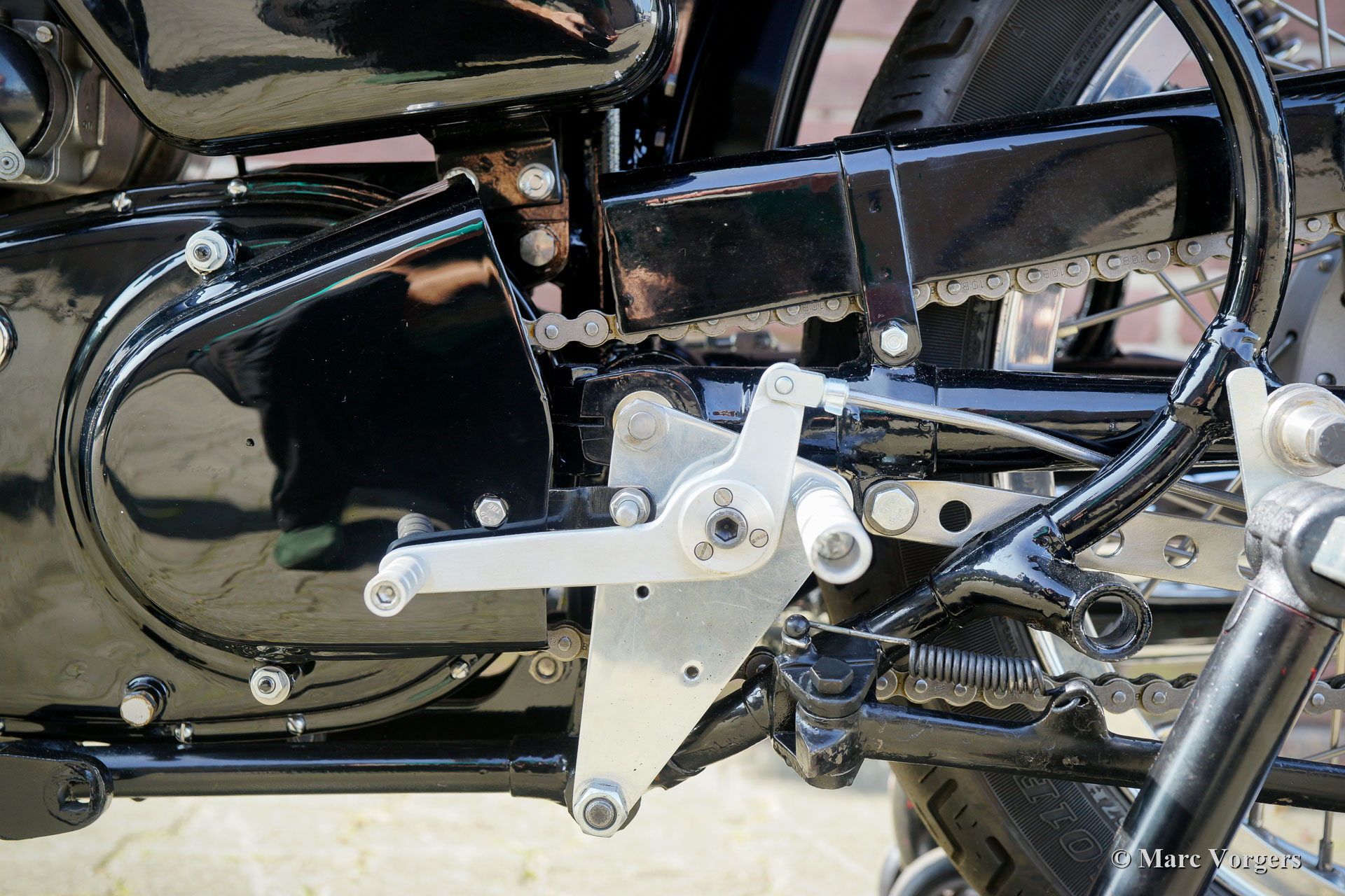 Velocette Venom Thruxton 500cc, jaar 1963. Kleur zwart met gouden striping. Velocette is een van de legendarische Britse motormerken. Velocette heeft vele overwinningen behaald in de geschiedenis van de motorsport en de machines waren zeer succesvol in de spannende ‘Manx’ TT-races op het eiland Man. De Venom Thruxton is een van hun laatste ontwerpen. De Venom Thruxton heeft een krachtige eencilinder viertaktmotor van 500 cc met bovenliggende kleppen. Deze Velocette Venom-motorfiets is volledig gerestaureerd, gereviseerd en opnieuw opgebouwd volgens Thruxton specificaties en volgens de hoogste normen. Halverwege de jaren zestig werd het motorblok gebruikt door de bekende Nederlandse motorcoureur Jan Strijbis die in 1976 als laatste racer deelnam aan een TT op een Velocette. Het motorblok werd opgebouwd met gebruikmaking van nieuwe onderdelen volgens de racespecificaties van Strijbis. Gemonteerd zijn een Thruxton cilinderkop met 2 inch inlaatklep, Thruxton Racing nokkenas, racekoppeling met 20 veren, een GP2 Amal race carburateur. De versnellingsbak is een Thruxton close-ratio-eenheid. De speciale race-krukas, drijfstang en zuiger zijn gebalanceerd en gewogen. Deze motor loopt indrukwekkend krachtig en is geschikt voor gebruik op de weg en op het circuit. De motorfiets toont de fantastische originele Velocette Venom en Thruxton details zoals de speciale benzinetank, de olietank met hitteschild, de grote geventileerde trommelrem voor en de aluminium velgen met RVS spaken. Deze zeldzame Velocette Venom Thruxton toont geweldig en zal een blikvanger zijn op elke historische motorbijeenkomst. Deze Velocette-motorfietsen zijn erg moeilijk te vinden, een bijzonder verzamelobject!