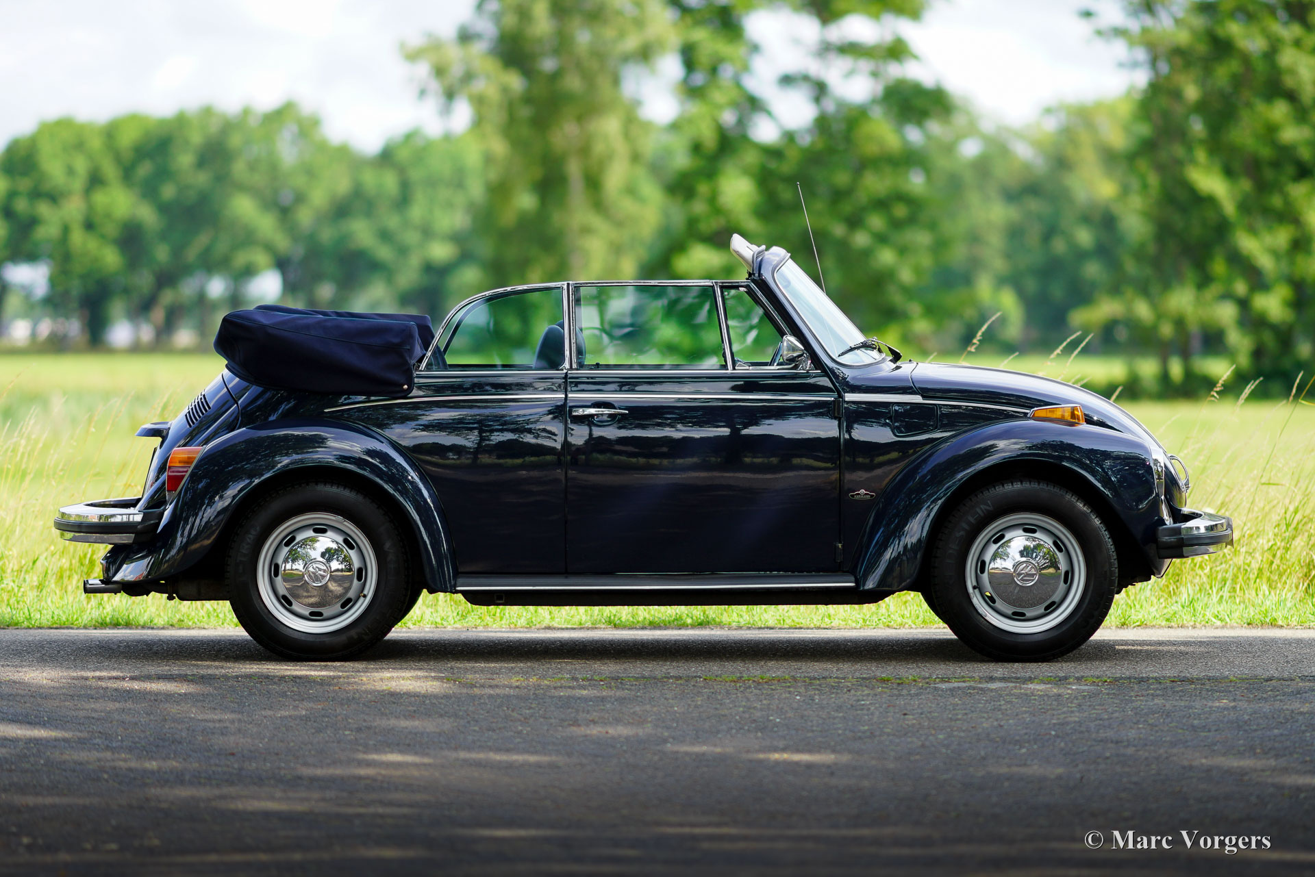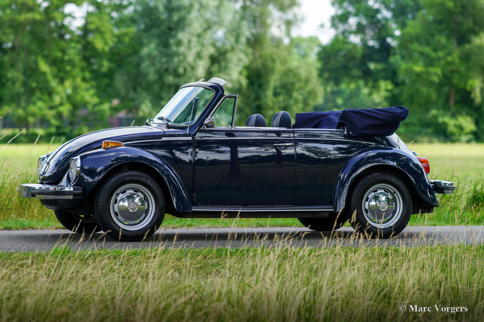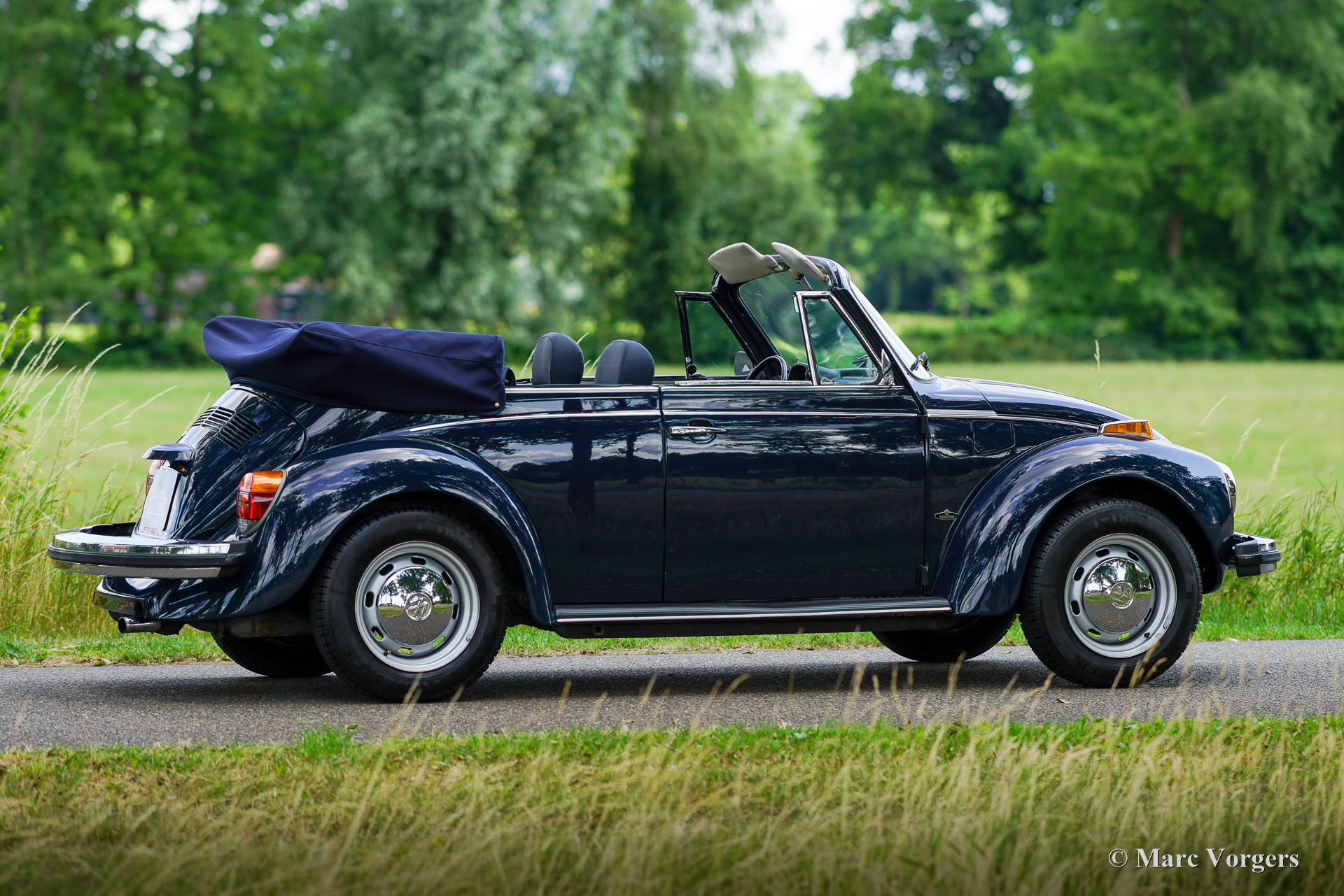 Volkswagen Kever 1303 cabriolet, jaar 1978. Kleur donkerblauw gecombineerd met een blauw interieur. Blauwe vinyl stoelen met stoffen zittingen, blauwe vinyl deurbekleding en blauw tapijt. Donkerblauwe mohair cabrioletkap en kapafdekking. Deze fantastische door Karmann gebouwde VW Kever cabriolet is in 1993 naar Nederland geïmporteerd. De automobiel verkeert in een excellente en super originele staat! De auto is in het verleden professioneel en perfect opnieuw gespoten. De carrosserie is in uitstekende staat, de chromen sierlijsten zijn prachtig en het originele interieur is geweldig! De Volkswagen Kever Cabriolet is een icoon in de automobielgeschiedenis. De auto biedt plaats aan 4 tot 5 personen en biedt heel veel rijplezier! De VW Kever wordt aangedreven door een achterin gemonteerde viercilinder luchtgekoelde boxermotor met een geweldige soundtrack! Het vermogen wordt via een handgeschakelde versnellingsbak met 4 versnellingen op de achterwielen overgebracht. Deze prachtige VW Kever cabriolet toont alle originele details, zoals het stuur met ‘Wolfsburg logo’ en de stalen velgen met chromen wieldoppen. De auto is voorzien van een Becker Europa radio met FM en een alarmsysteem. Deze begeerlijke schoonheid is klaar om afgeleverd te worden aan een trotse nieuwe eigenaar! Geniet van de stijlvolle klassieke levensstijl!