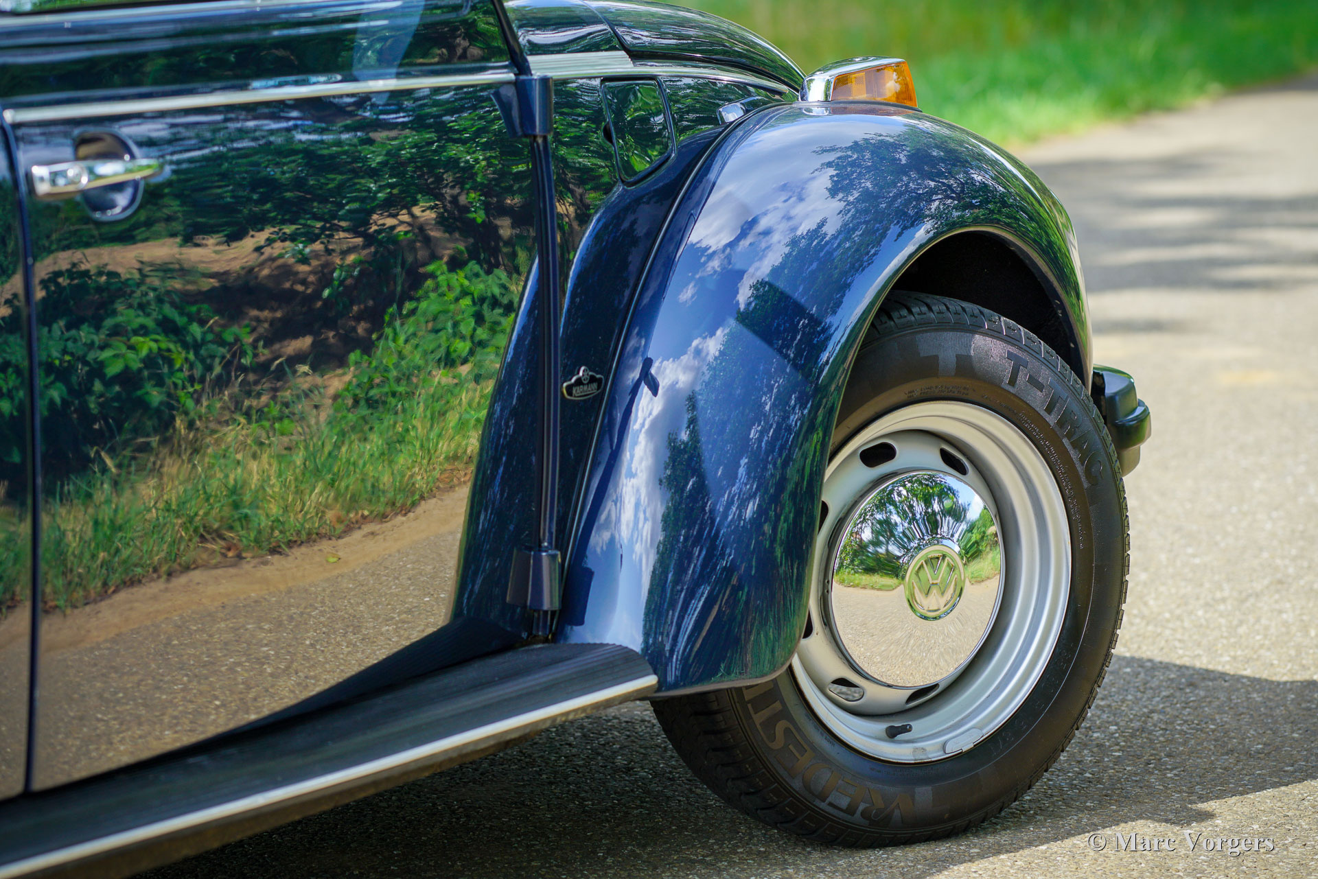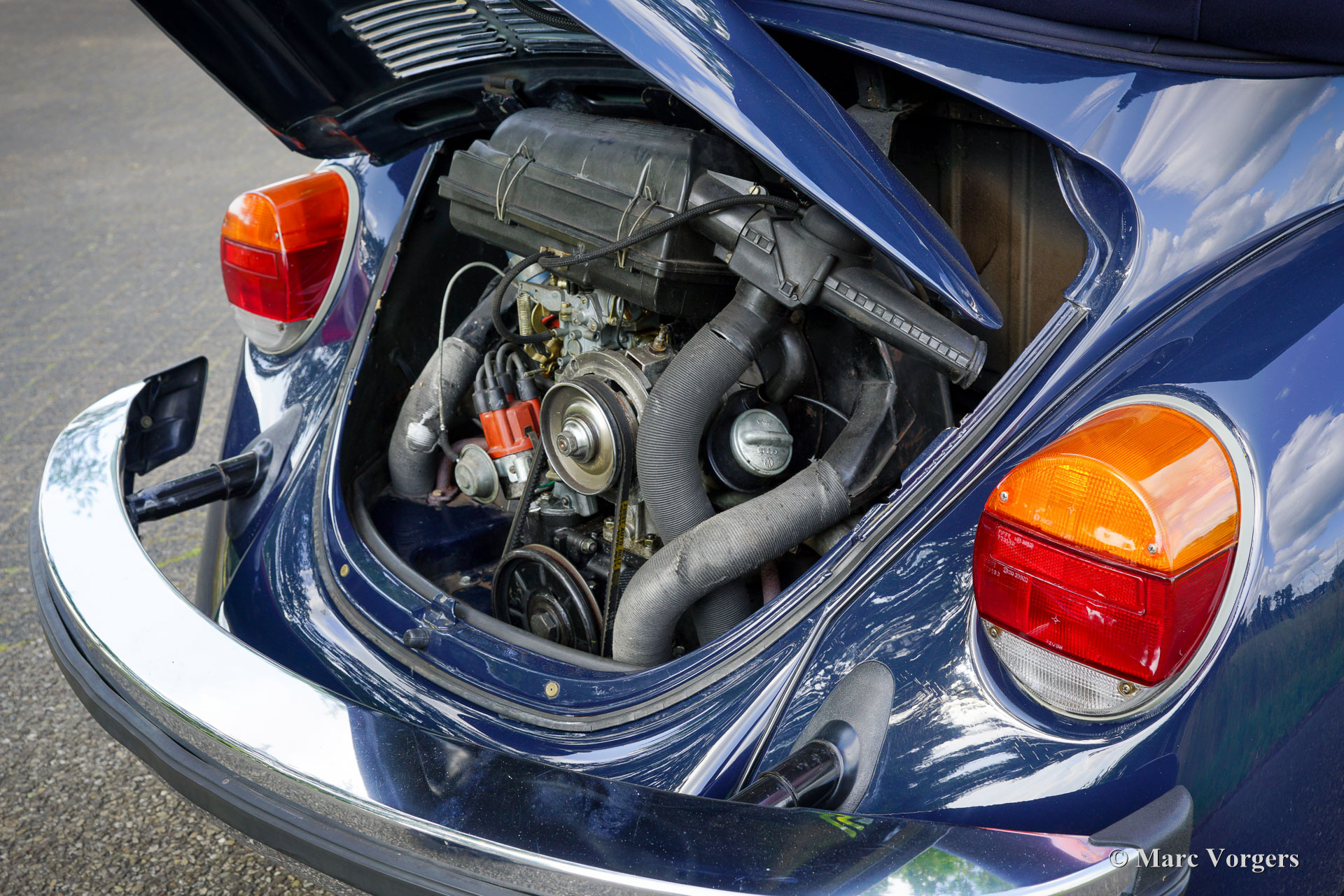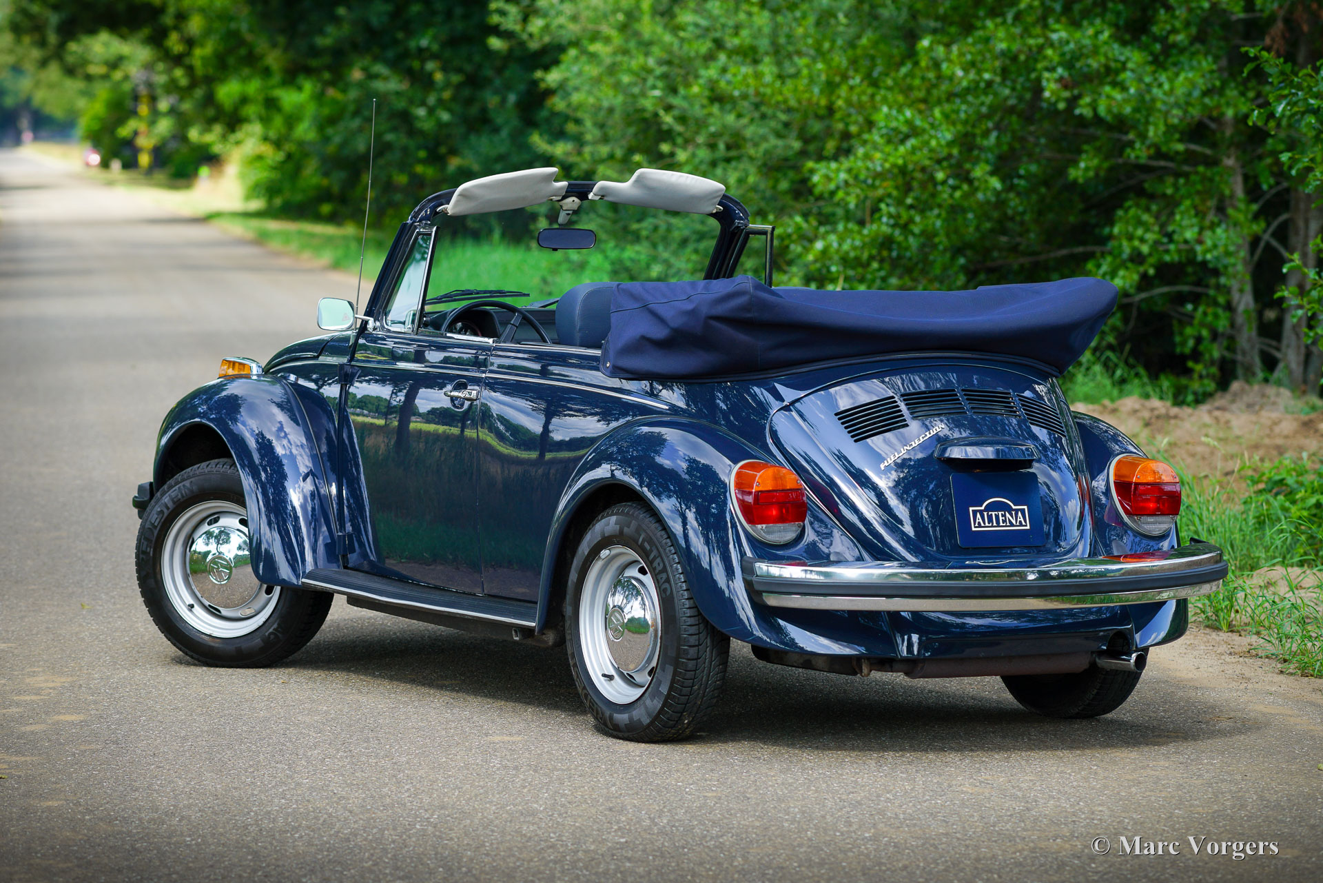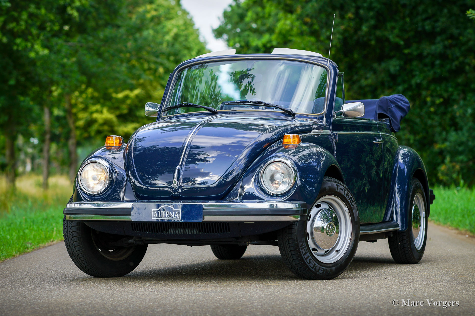 Volkswagen Kever 1303 cabriolet, jaar 1978. Kleur donkerblauw gecombineerd met een blauw interieur. Blauwe vinyl stoelen met stoffen zittingen, blauwe vinyl deurbekleding en blauw tapijt. Donkerblauwe mohair cabrioletkap en kapafdekking. Deze fantastische door Karmann gebouwde VW Kever cabriolet is in 1993 naar Nederland geïmporteerd. De automobiel verkeert in een excellente en super originele staat! De auto is in het verleden professioneel en perfect opnieuw gespoten. De carrosserie is in uitstekende staat, de chromen sierlijsten zijn prachtig en het originele interieur is geweldig! De Volkswagen Kever Cabriolet is een icoon in de automobielgeschiedenis. De auto biedt plaats aan 4 tot 5 personen en biedt heel veel rijplezier! De VW Kever wordt aangedreven door een achterin gemonteerde viercilinder luchtgekoelde boxermotor met een geweldige soundtrack! Het vermogen wordt via een handgeschakelde versnellingsbak met 4 versnellingen op de achterwielen overgebracht. Deze prachtige VW Kever cabriolet toont alle originele details, zoals het stuur met ‘Wolfsburg logo’ en de stalen velgen met chromen wieldoppen. De auto is voorzien van een Becker Europa radio met FM en een alarmsysteem. Deze begeerlijke schoonheid is klaar om afgeleverd te worden aan een trotse nieuwe eigenaar! Geniet van de stijlvolle klassieke levensstijl!