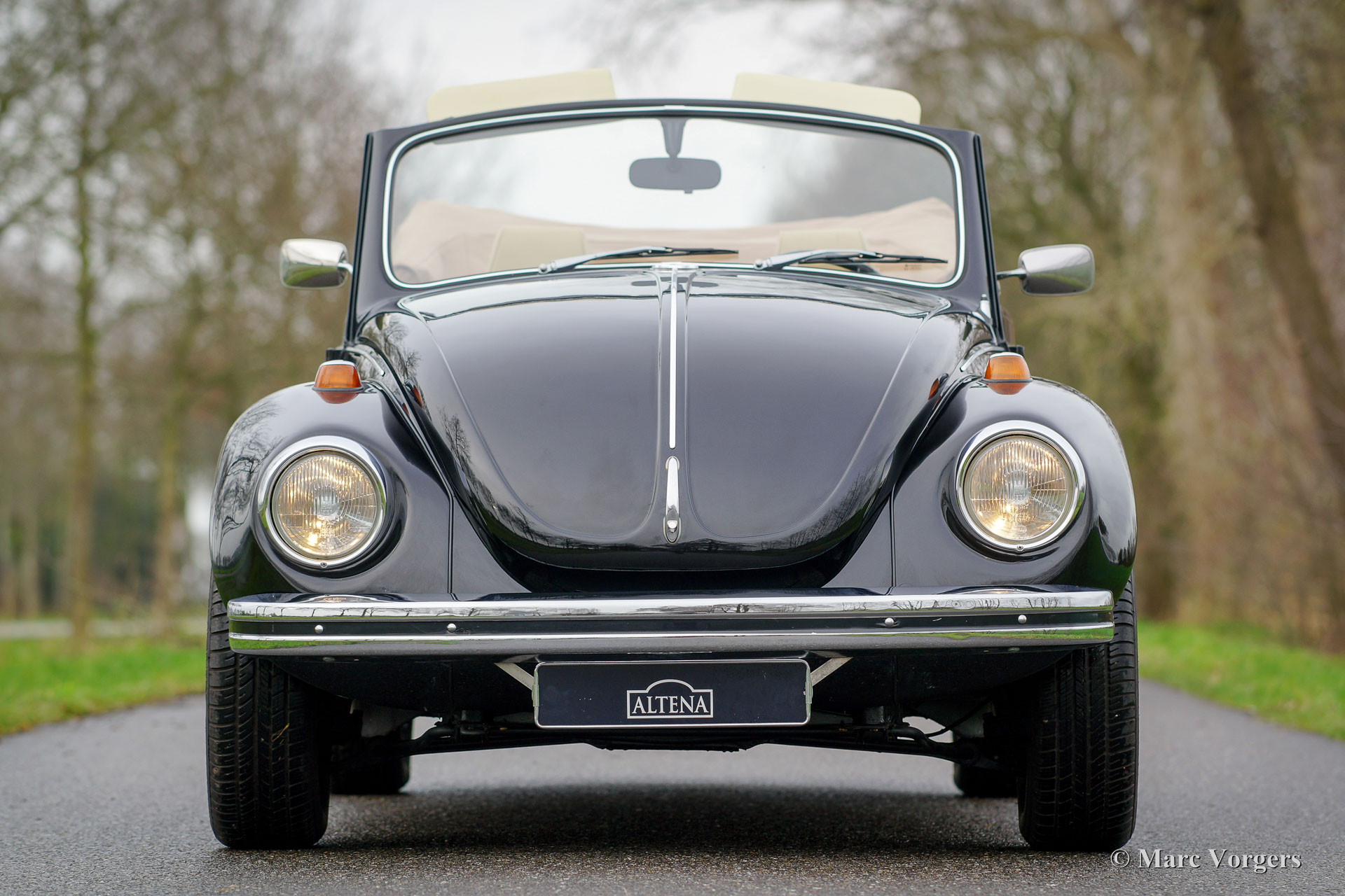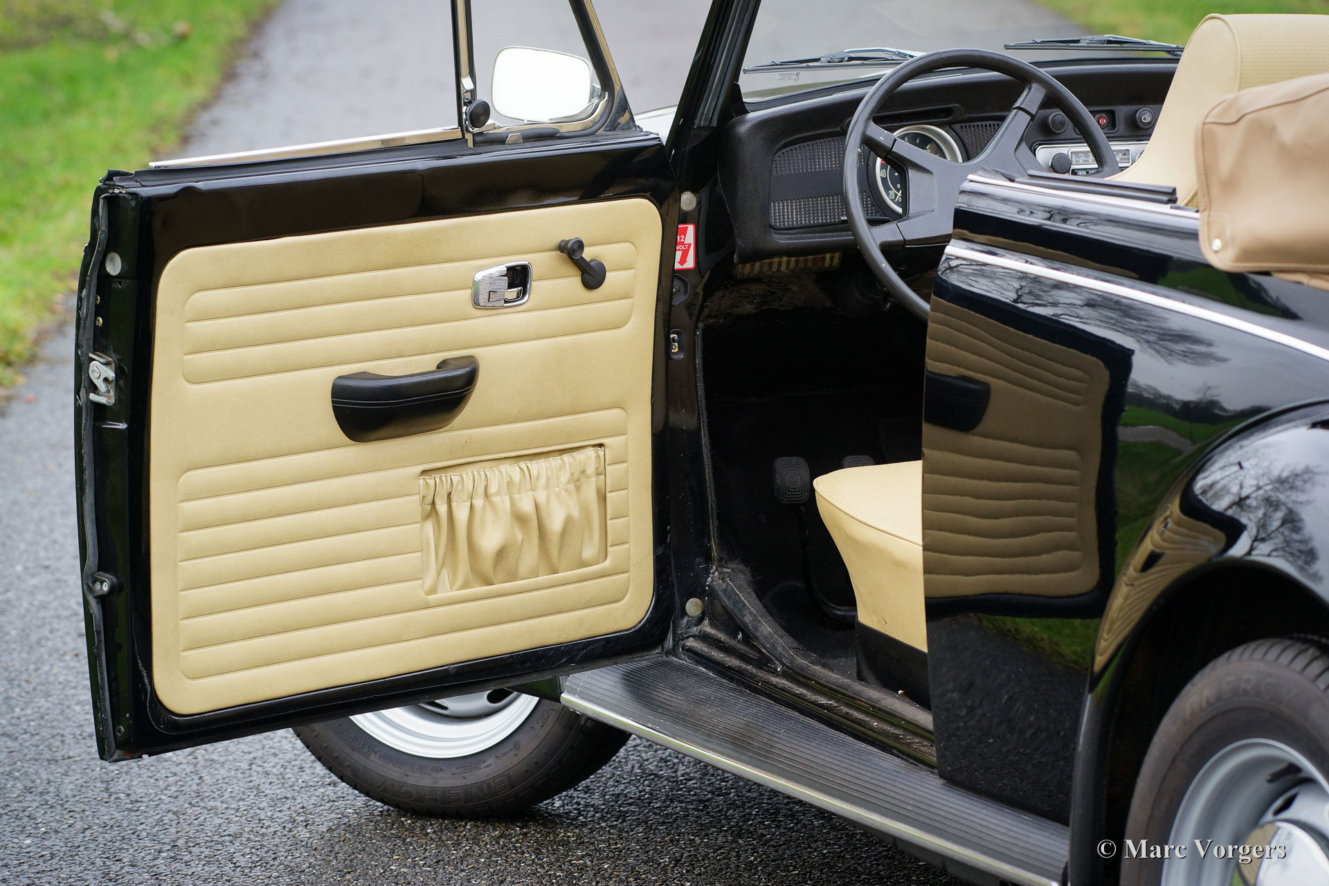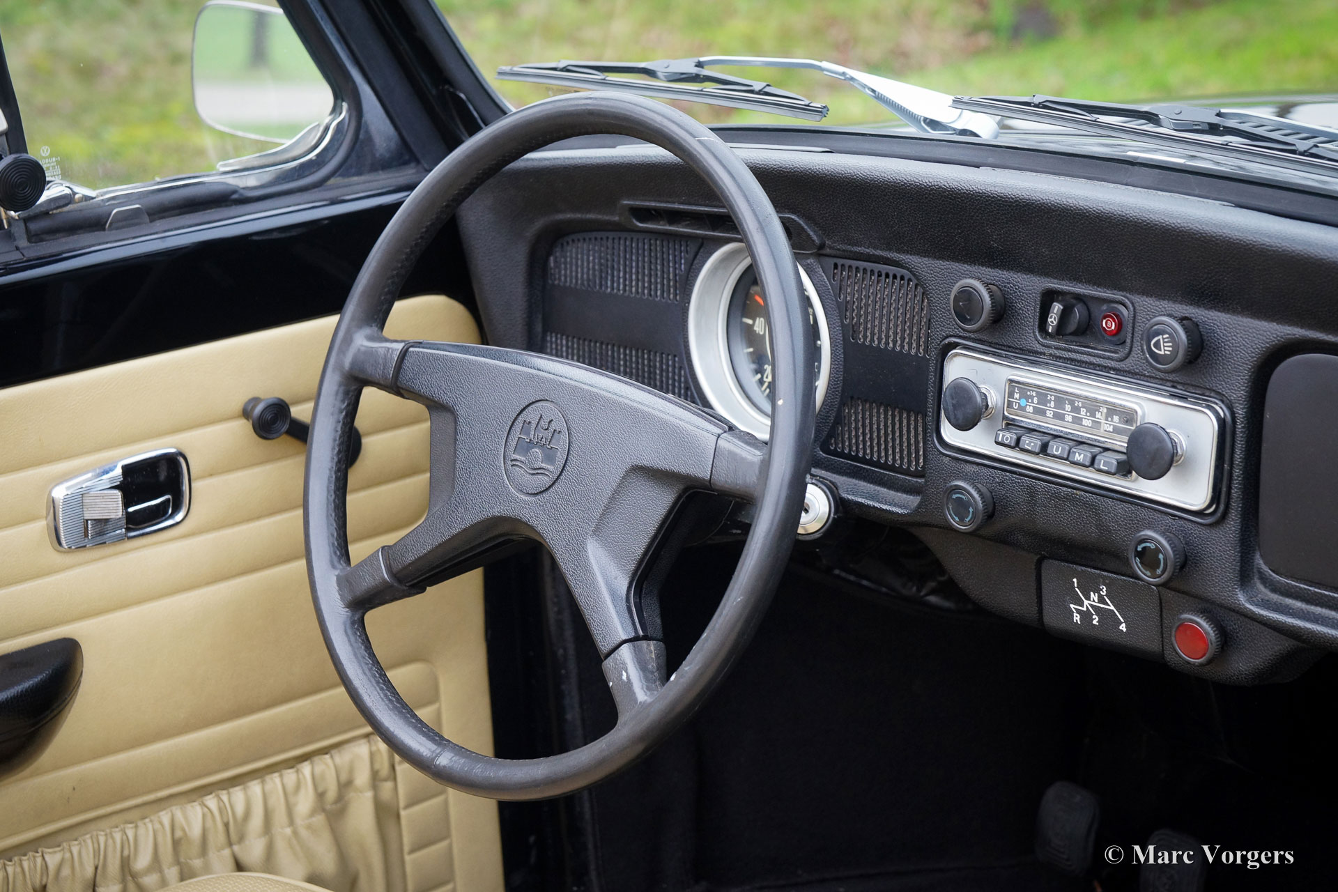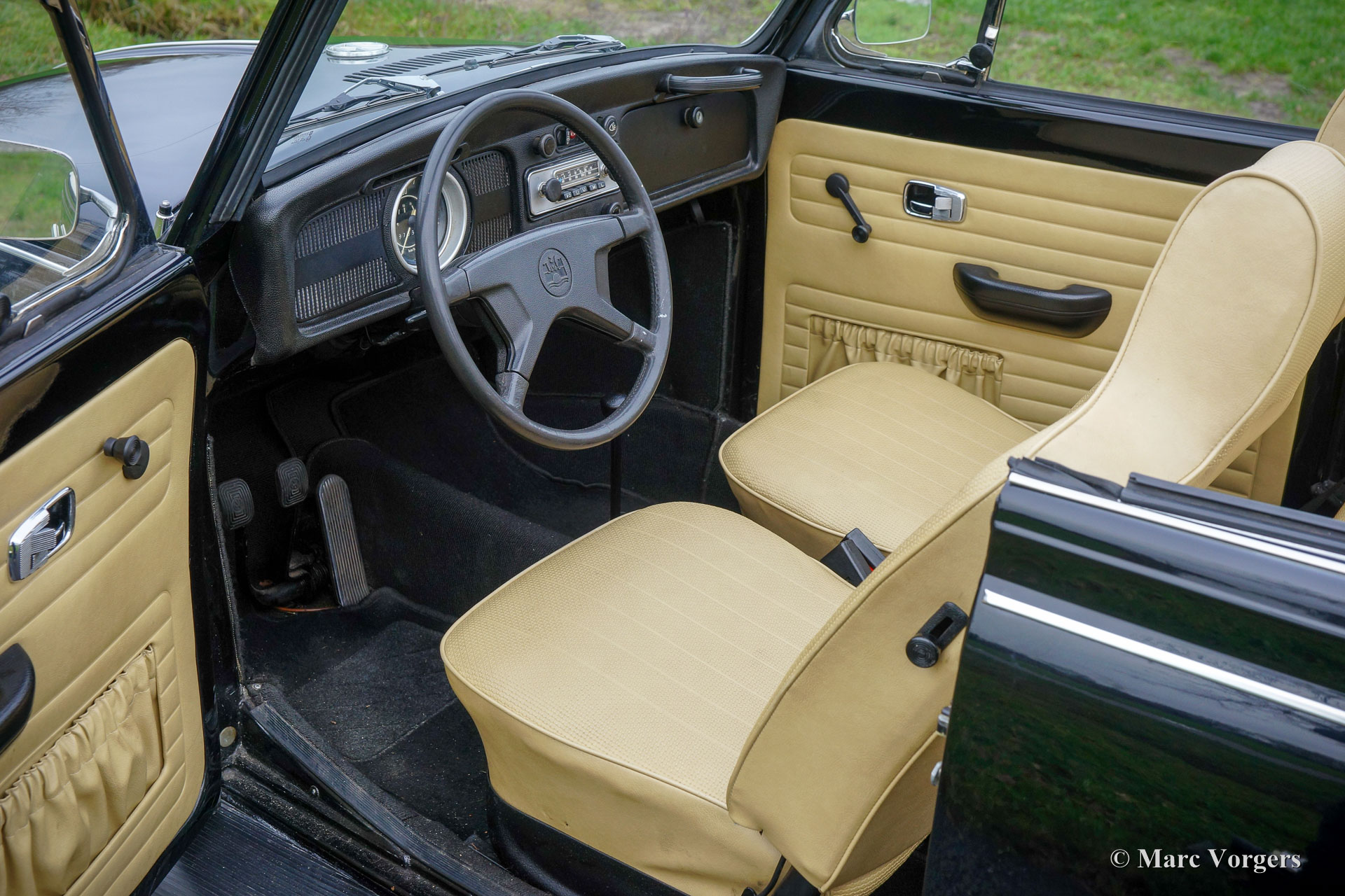 Volkswagen ‘Kever’ 1302 LS cabriolet, jaar 1971. Chassisnummer 151293790X. Kleur zwart met een lichtbeige kunstleren interieur en zwart tapijt. Donker beige mohair kap en een bijpassende kap-afdekking. Deze prachtige VW ‘Kever’ is een vrij zeldzaam 1302-model uitgerust met een platte voorruit; dit model werd slechts een jaar gebouwd. De auto werd nieuw afgeleverd in Duitsland. In het jaar 2009 werd de VW in Nederland geïmporteerd waar de auto uitvoerig is gerestaureerd. Een fotoreportage van de restauratie is aanwezig. Deze fraaie Volkswagen ‘Kever’ cabriolet verkeert in excellente tot sublieme staat en de auto rijdt perfect. De auto beschikt over een krachtige 1570 cc-motor, originele 15-inch wielen met originele chroom wieldoppennaaf, Michelin-banden en een originele radio. De auto wordt geleverd met de oude Duitse papieren, vier originele Nederlandse boekjes, inclusief het instructieboekje en diverse (onderhoud) rekeningen. Dit is een voortreffelijk exemplaar, een klassieke cabriolet waarvan het hele gezin kan meegenieten!
