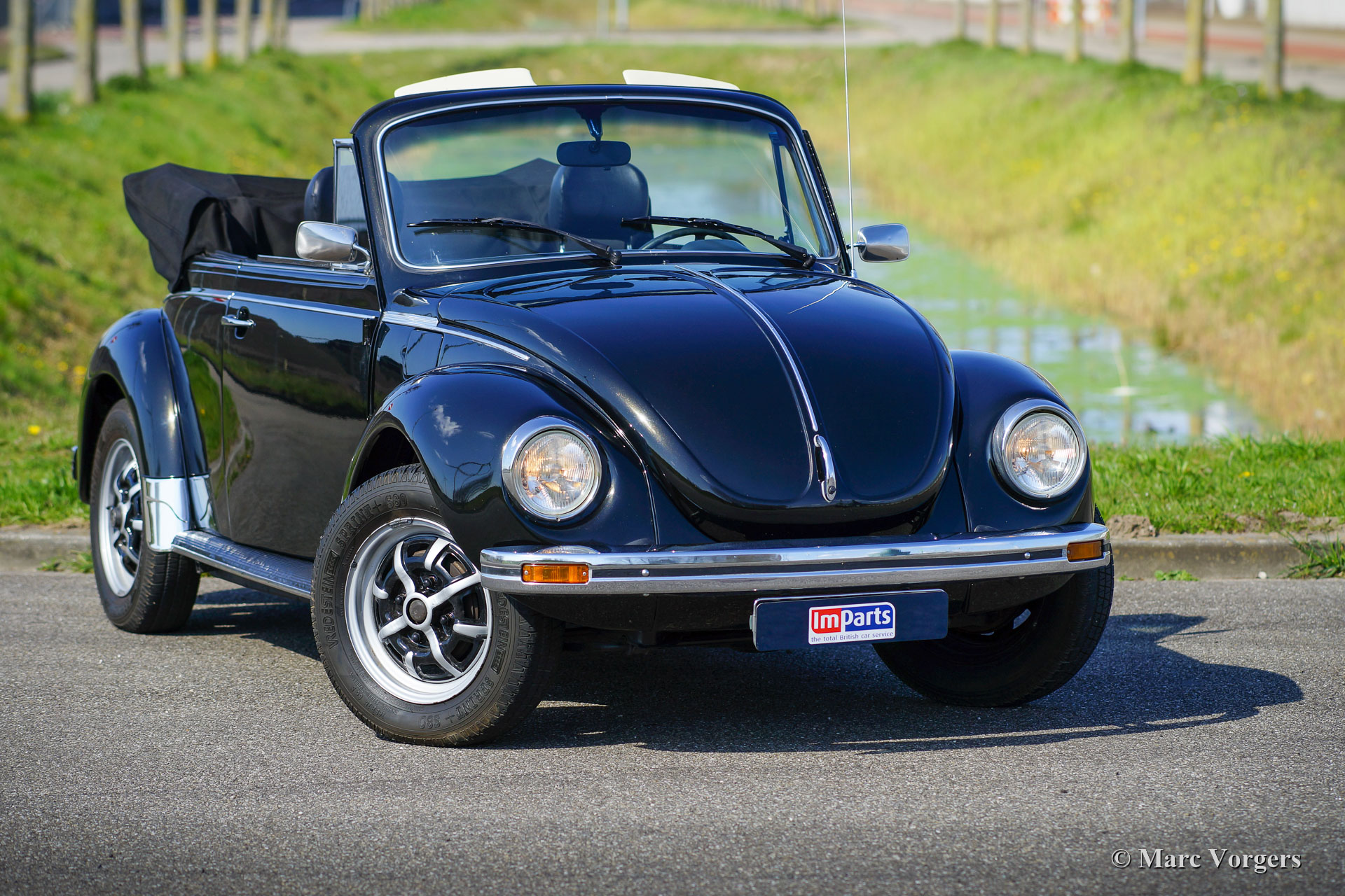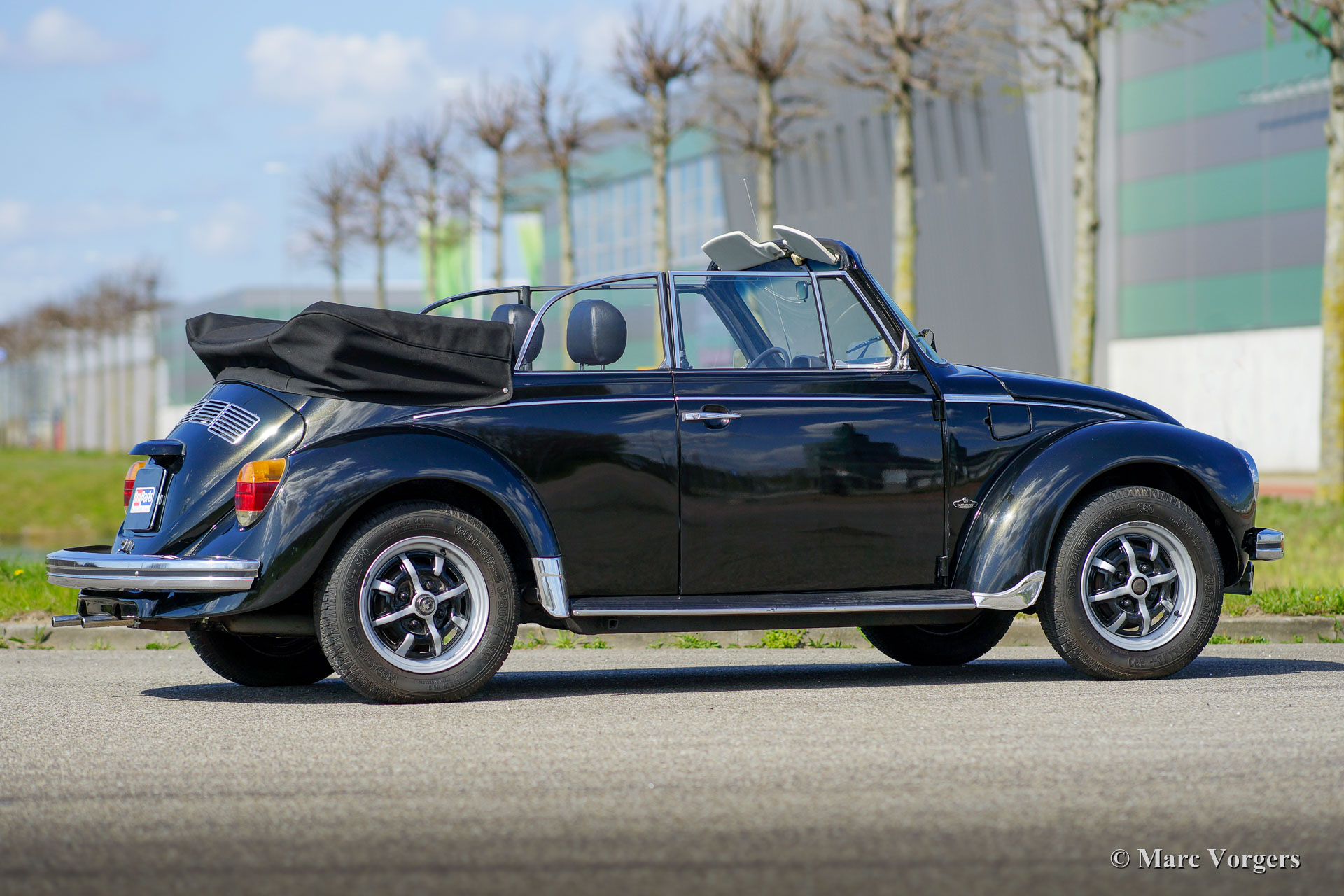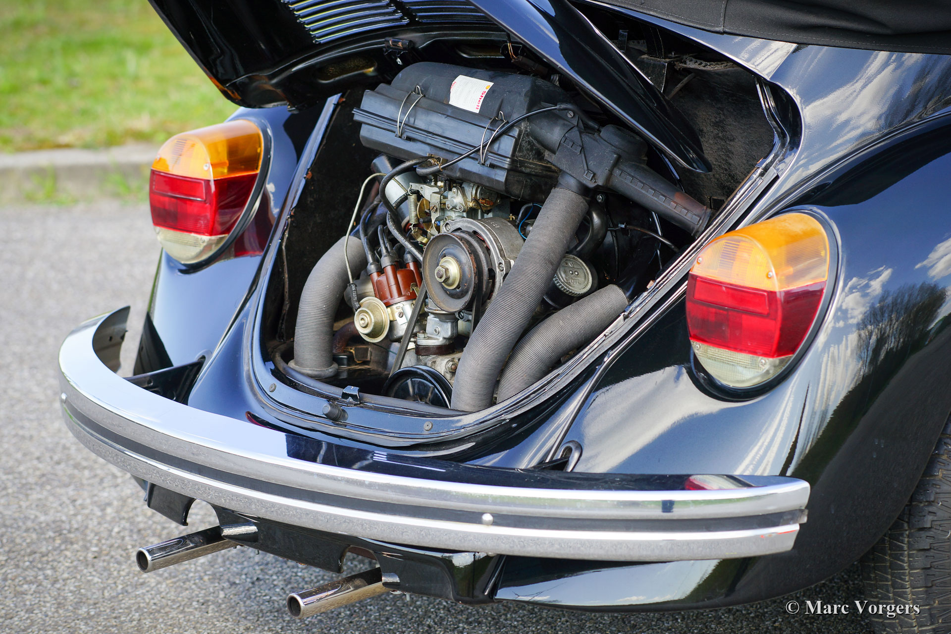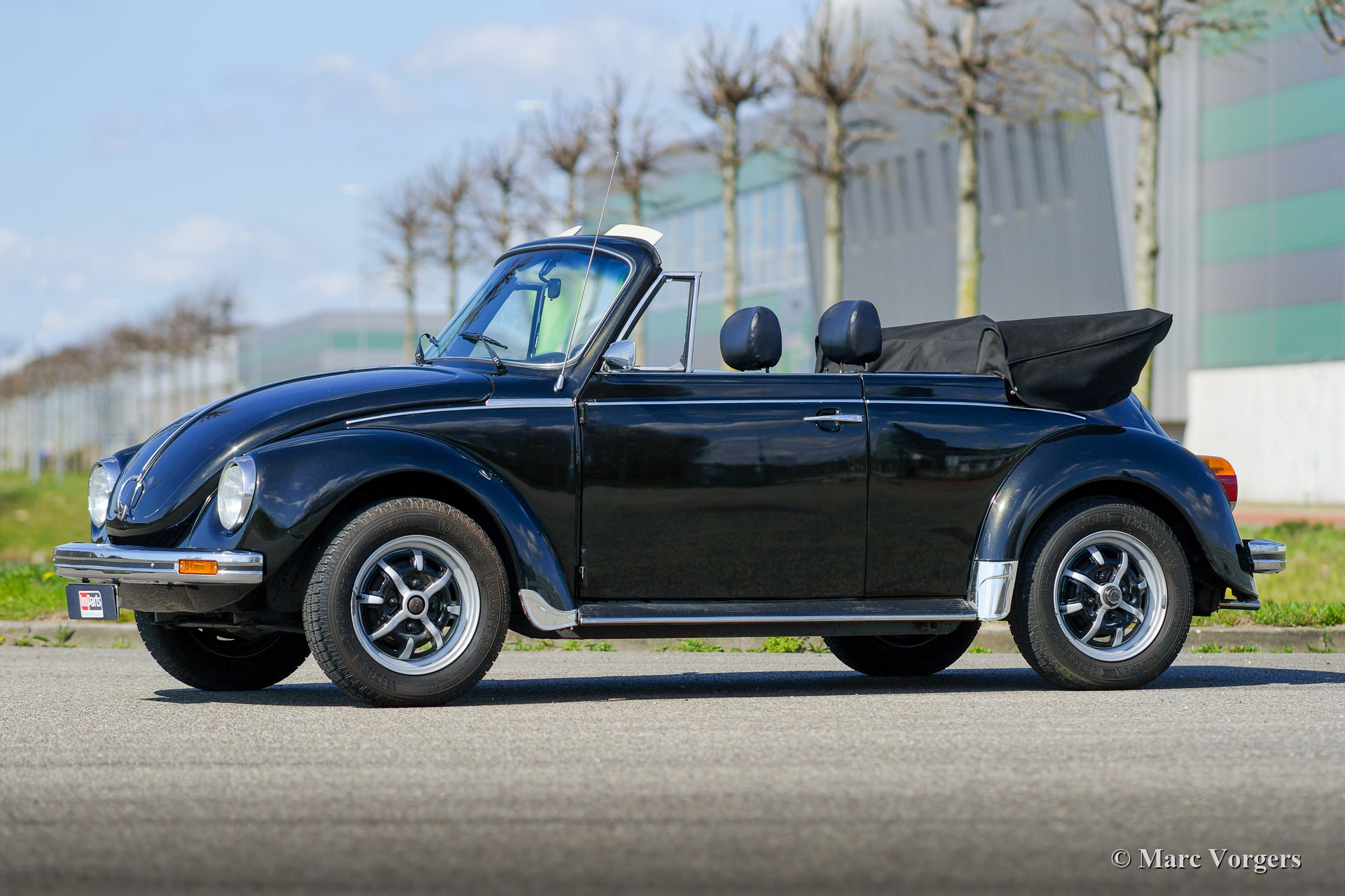 Volkswagen Kever 1303 Cabriolet, jaar 1978. Kleur zwart metallic gecombineerd met een zwart kunstlederen interieur, zwart tapijt, een beige kap en een zwarte kapafdekking. Deze prachtige VW Kever 1303 Cabriolet verkeert in een zeer goede tot excellente conditie en de auto rijdt perfect. De auto is recentelijk voorzien van prachtige nieuwe lak. Het originele interieur verkeert in uitstekende staat met slechts lichte sporen van gebruik. In de kofferbak en in de motorruimte ziet alles er prachtig verzorgd uit. De 1600 cc luchtgekoelde viercilinder boxermotor loopt en klinkt perfect en de auto stuurt, schakelt en remt zeer goed. De VW Kever is een icoon en de cabriolet is het topmodel van de serie. De VW Kever cabriolet is een geweldige auto om met 4-5 personen te genieten van weekendritten en om samen te genieten van zonnige vakantiereizen! Dit is een prachtig exemplaar voor de echte liefhebber.