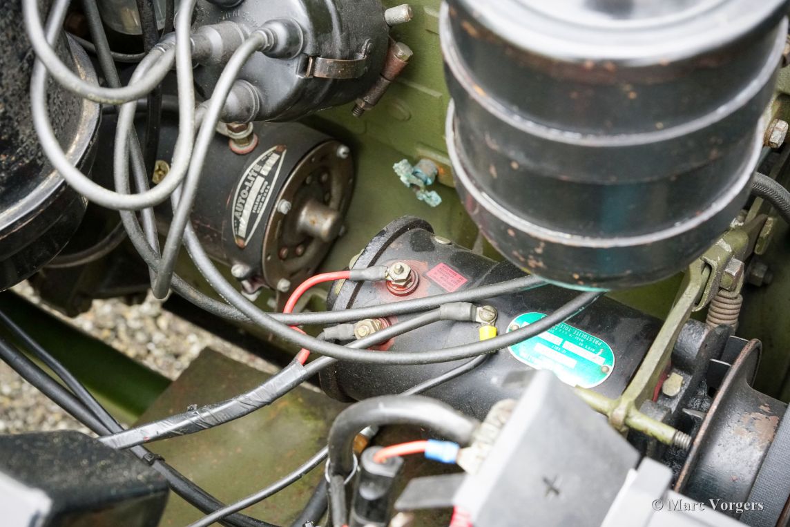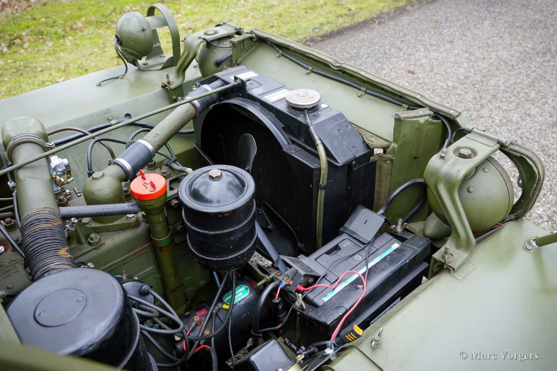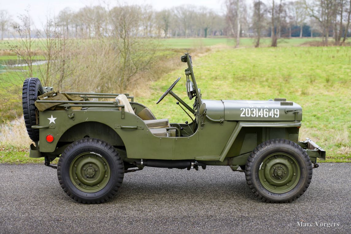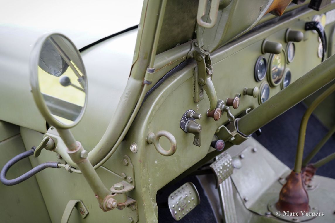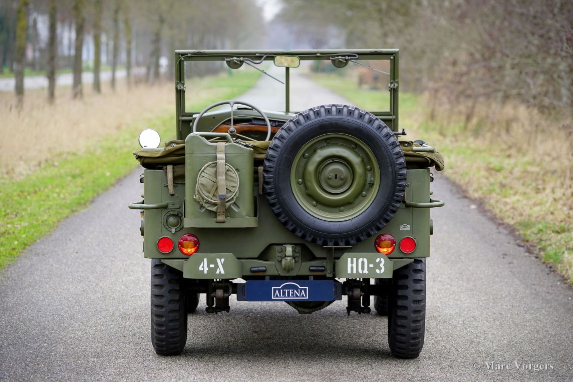 Willys MB Jeep, bouwjaar 1944. Kleur legergroen gecombineerd met lichtgroen/beige canvas stoelbekleding en los zwart tapijt. Deze Willys MB Jeep is een origineel exemplaar uit 1944 in zeer goede en complete staat! De auto heeft fantastische details (waaronder een geweer op de juiste plek) en rijdt uitstekend! Deze Willys Jeep werd in 2002 vanuit Californië naar Duitsland geïmporteerd. De auto is in Duitsland grondig gerestaureerd. Vorig jaar is de Jeep volledig up-to-date gebracht door Altena Classic Service. De kosten voor deze uitgebreide onderhoudsbeurt bedroegen € 7.500. De auto wordt geleverd met de juiste papieren voor kentekenregistratie. Een zeer goed onderhouden exemplaar!